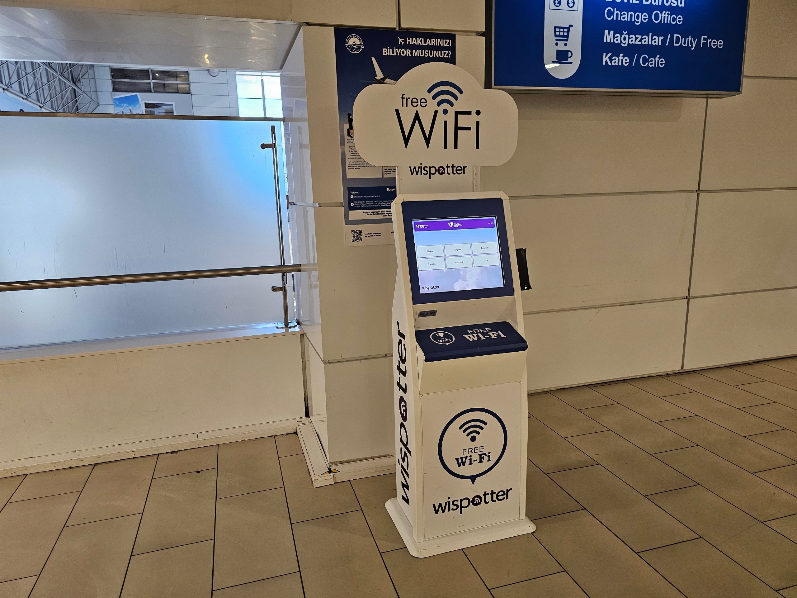 Le wi-fi gratuit n'est disponible que pendant 60 minutes. Le mot de passe ne peut être obtenu que dans les kiosques officiels situés dans tout l'aéroport, où vous devez entrer un numéro de téléphone réel ou scanner votre passeport.