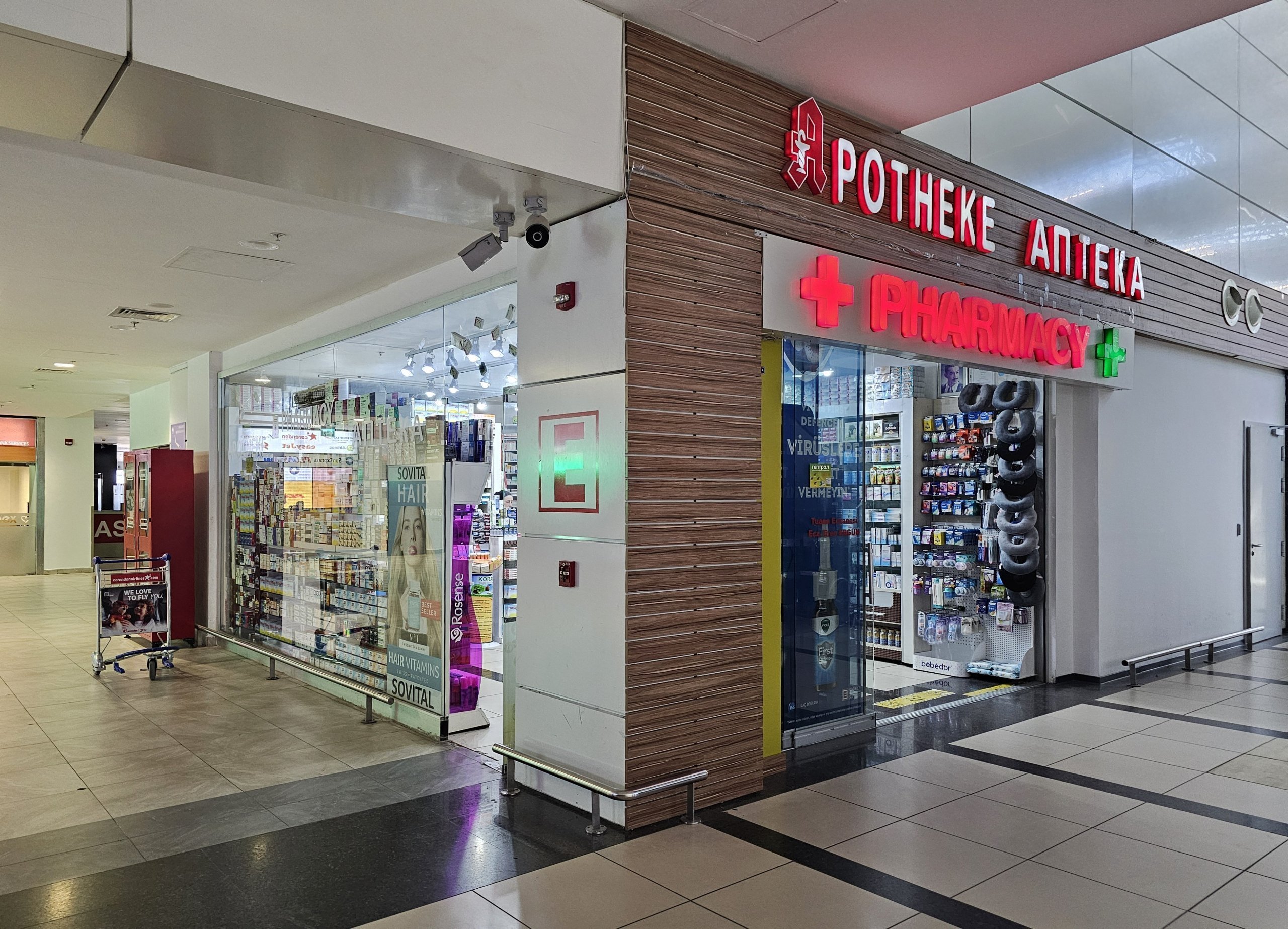 Les pharmacies se trouvent dans les zones publiques des deux terminaux (ouvertes 24 heures sur 24 et 7 jours sur 7 dans le terminal 1, ouvertes de 9 heures à 18 heures dans le terminal 2).