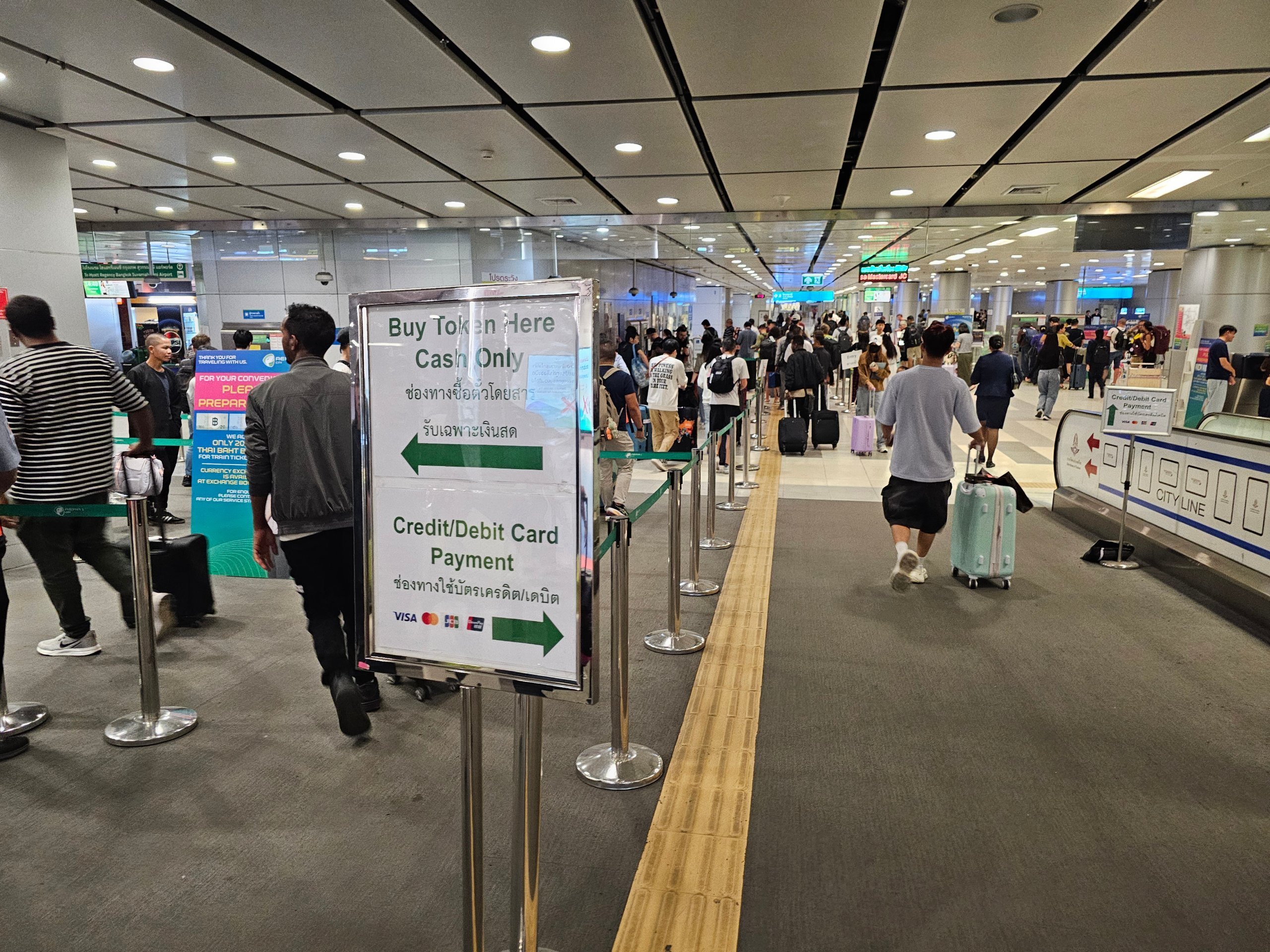 Vous ne pouvez payer qu'en espèces (la machine accepte les billets jusqu'à 100 thb). On vous donne un jeton en plastique que vous "biperez" au tourniquet (le jeton est muni d'une puce) et que vous laisserez tomber dans le tourniquet lorsque vous descendrez.