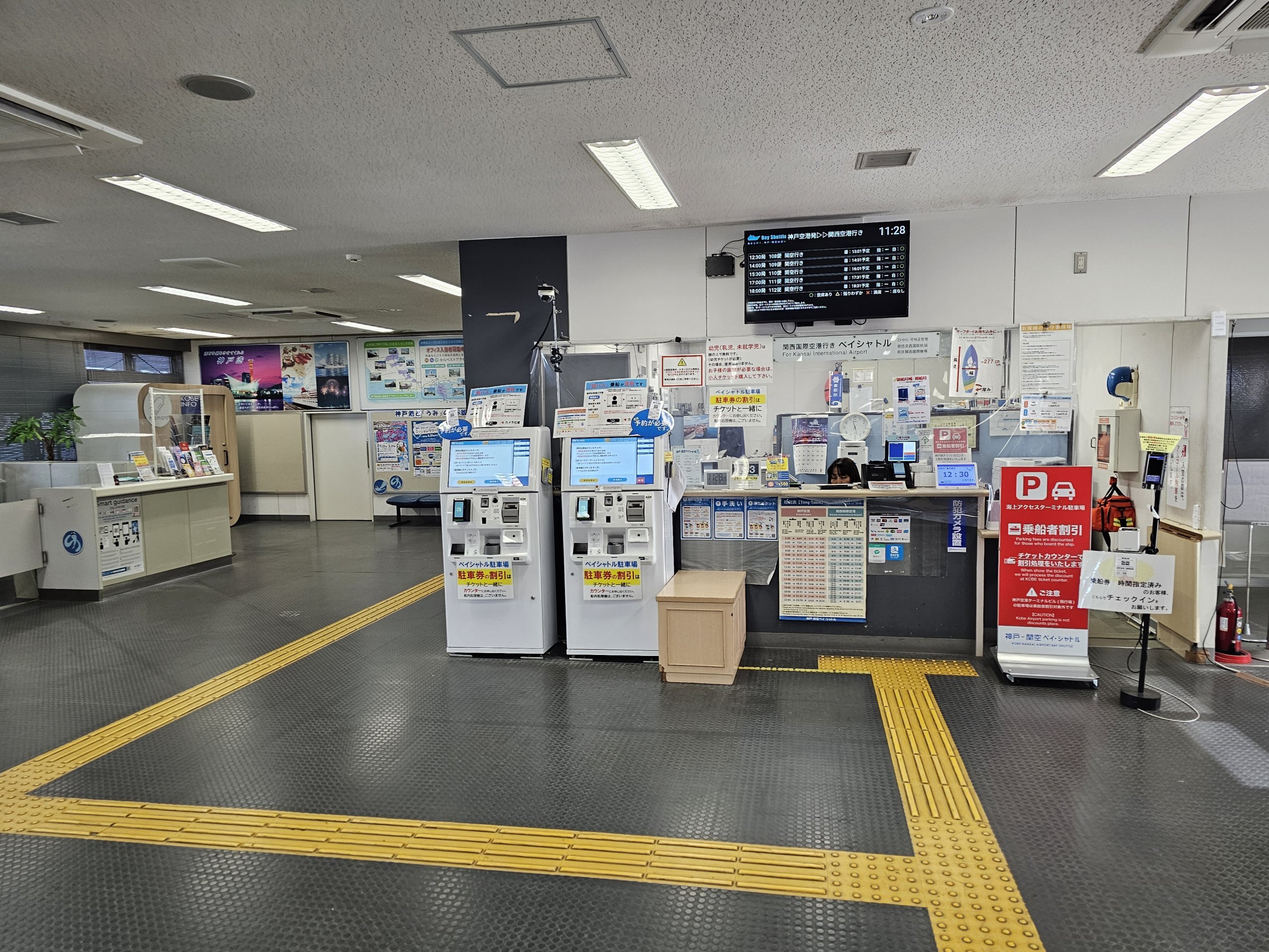 Une navette gratuite reliant les terminaux 1 et 2 s'arrête à l'embarcadère et assure la liaison avec tous les ferries. Voir les horaires détaillés : kobe-access.jp