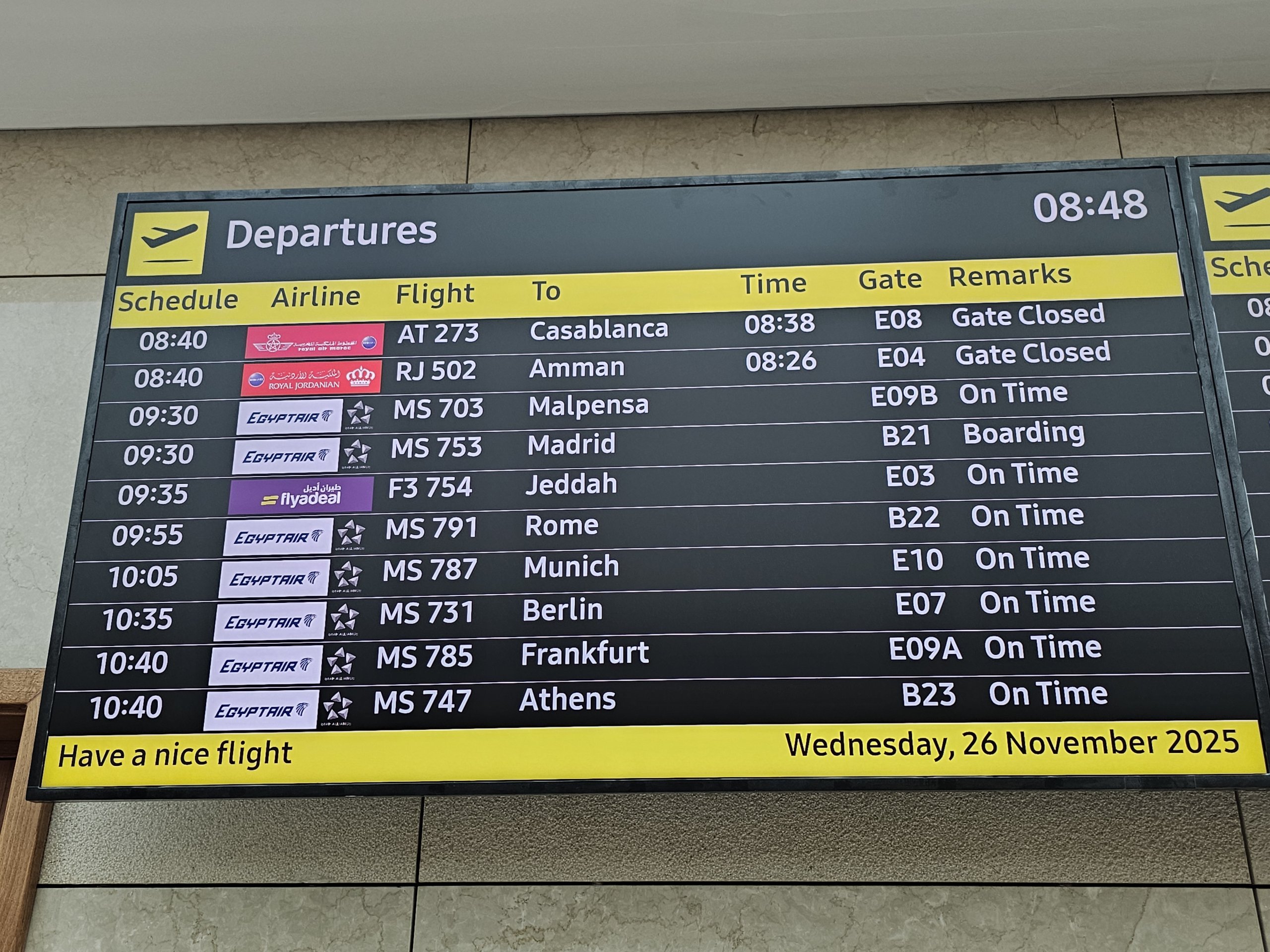 Vous recherchez les arrivées ou les départs vers/depuis l'aéroport du Caire en ligne et en temps réel pour vérifier les retards ou les heures d'embarquement? Le site officiel de l'aéroport offre toujours les informations les plus précises :