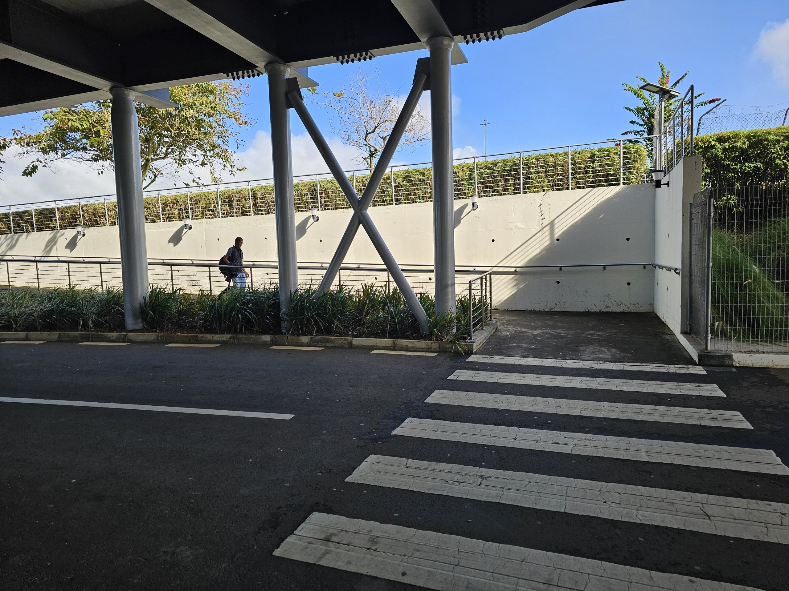 L'arrêt de bus à l'aéroport n'est pas indiqué. Sortez du hall des arrivées sur la gauche, traversez le parking des bus de l'agence de tourisme et suivez le trottoir en diagonale vers le haut sur la droite.