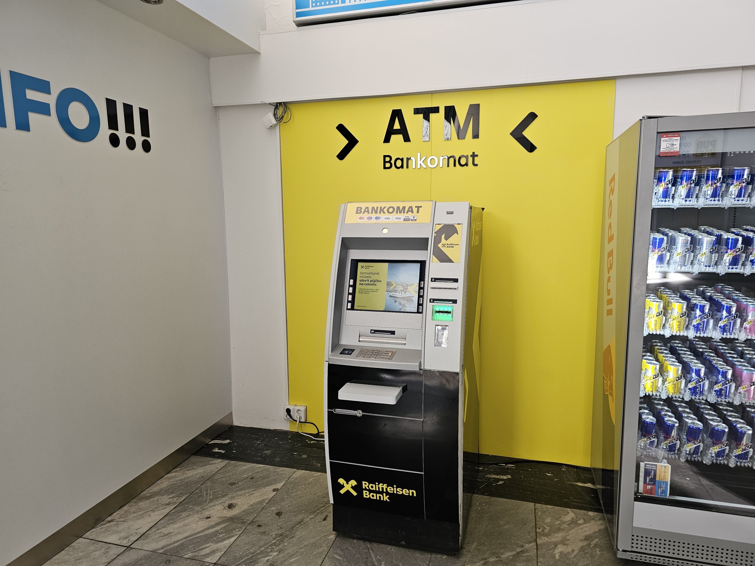 Vous pouvez utiliser le distributeur de billets de la banque Raiffeisen dans la zone publique du hall des arrivées.