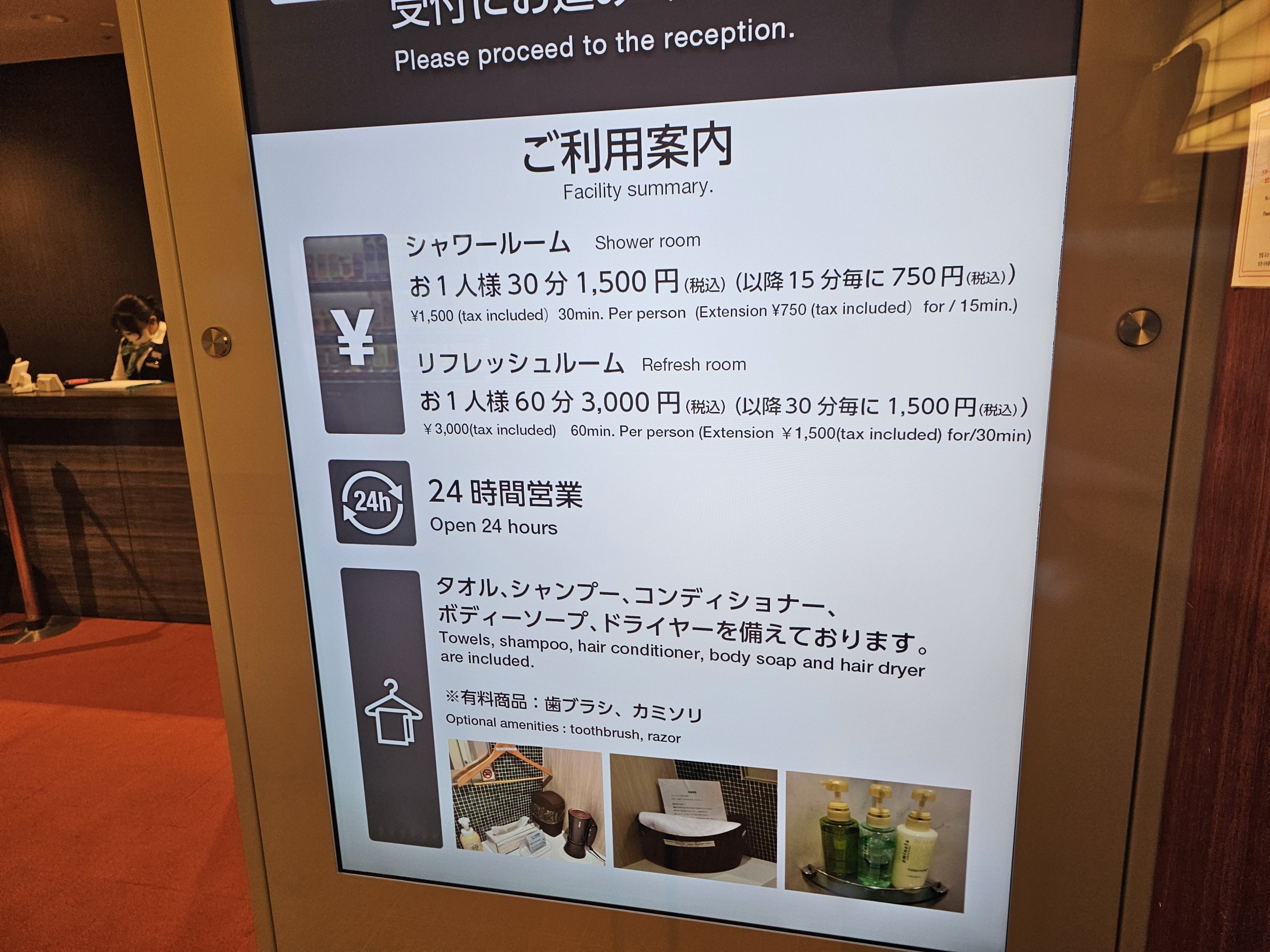 - Salle de douche - zone publique, Arrivées 2F, ouverte de 5:00 à 21:00, tarif pour une douche de 30 minutes : 1 500 jpy