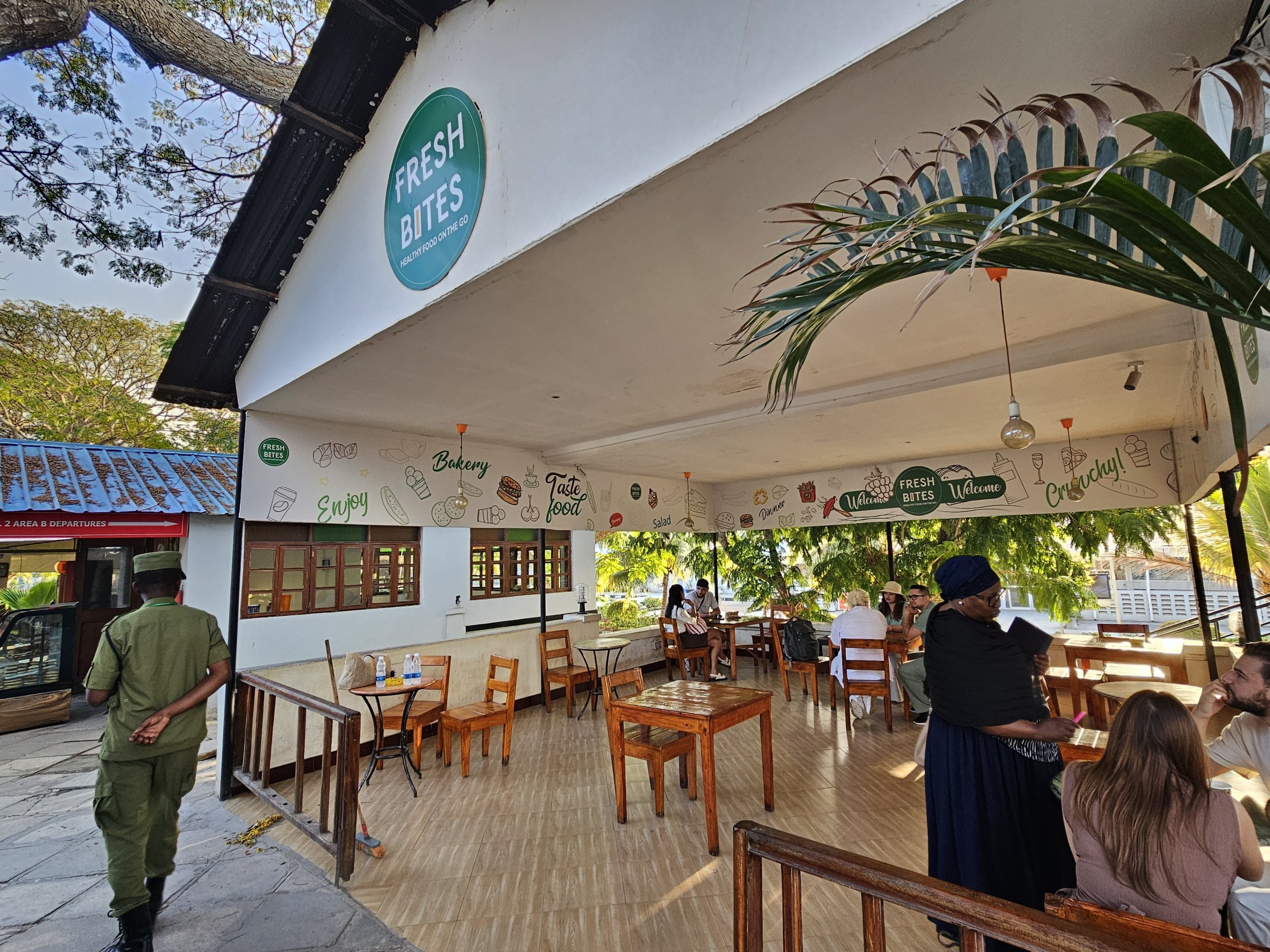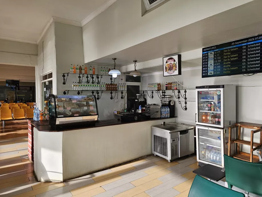 Dans le terminal international, vous trouverez un restaurant, un bar et un petit bistrot après le contrôle de sécurité. Les prix y sont plusieurs fois plus élevés que partout ailleurs à Zanzibar.