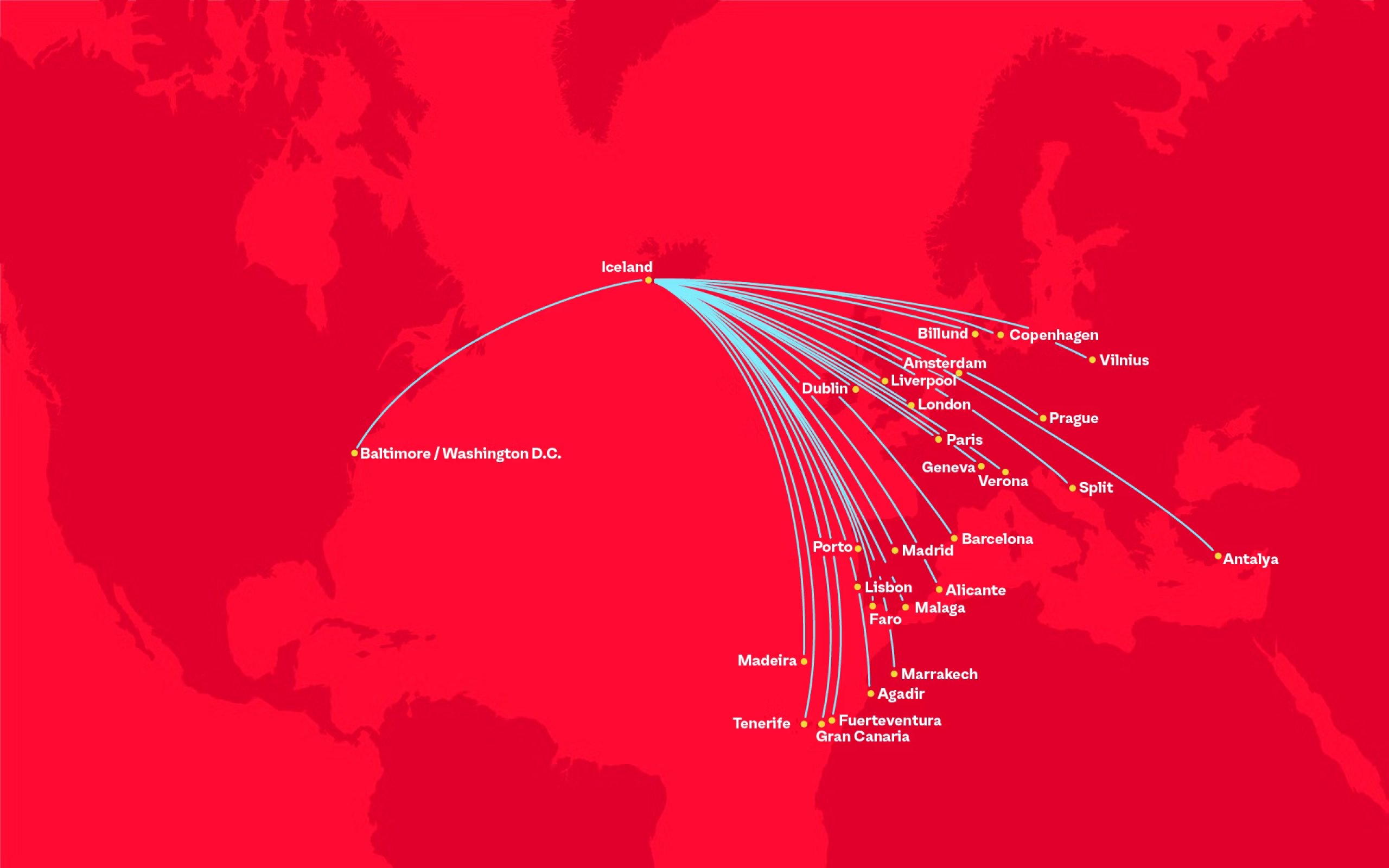 Les vols vers l'Amérique du Nord ont été progressivement supprimés, l'accent étant mis sur le transport des Islandais vers les destinations de vacances au bord de la mer, ainsi que sur les liaisons ayant le potentiel inverse, à savoir faire venir des touristes en Islande. Par exemple, les liaisons au départ de Prague PRG, Varsovie WAW, Londres STN, Vilnius VNO ou Paris CDG étaient très prisées.