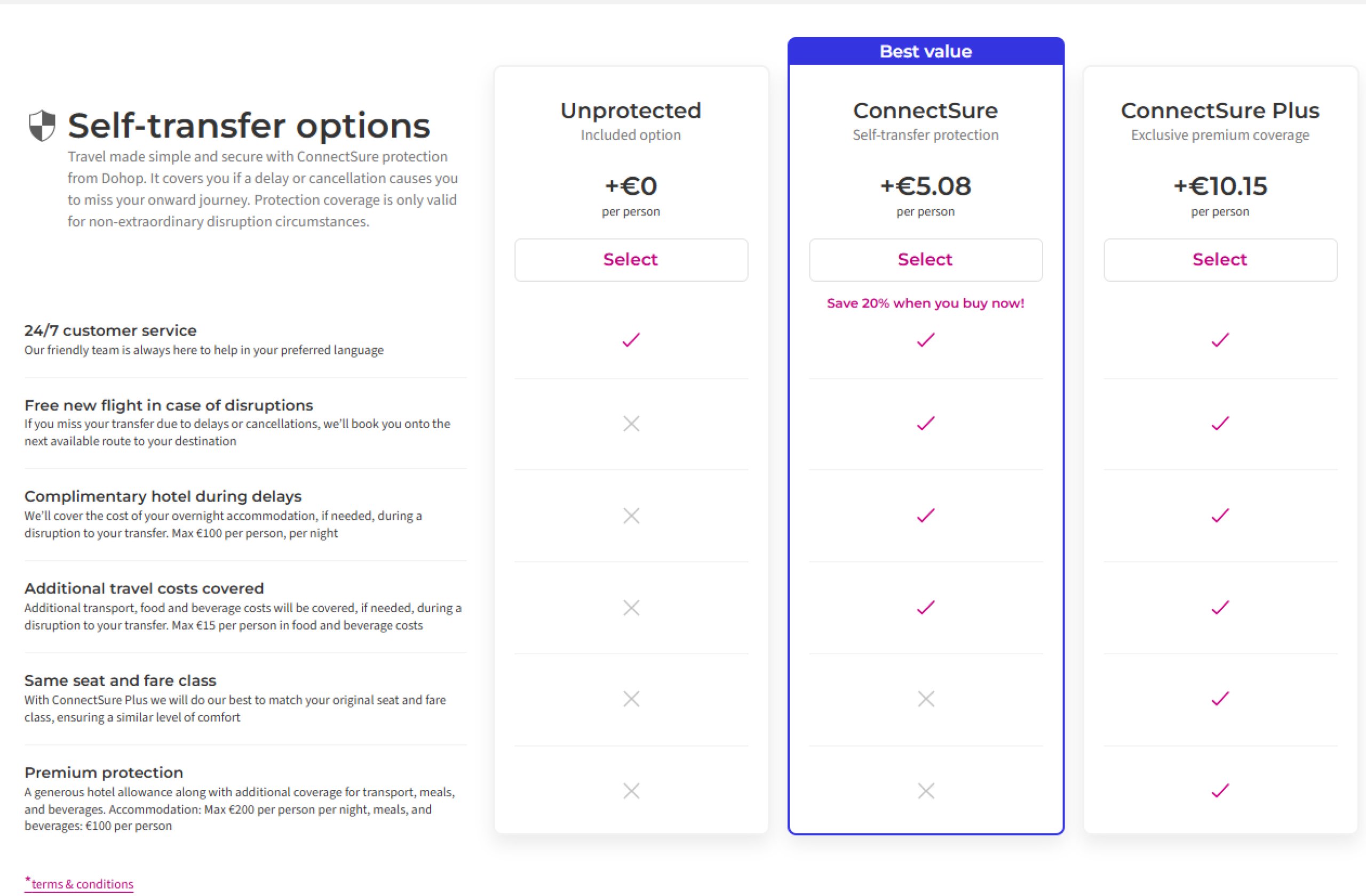 Si vous souhaitez bénéficier d'une correspondance garantie, vous devez également acheter ConnectSure en même temps que vos billets, ce qui est sélectionné lors de la procédure de réservation du vol.