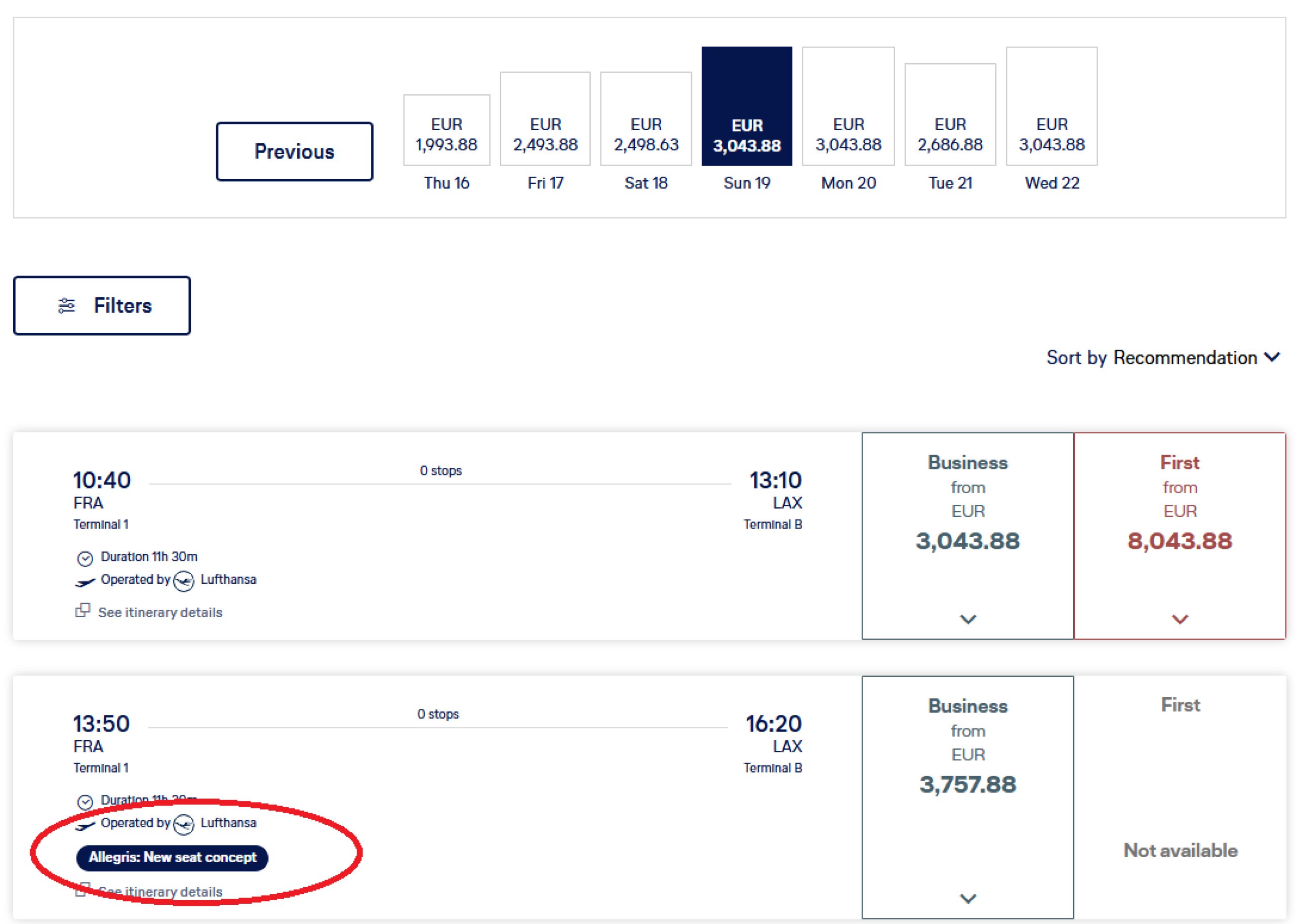 Il est toujours important de choisir un numéro de vol spécifique. Sur certaines lignes (par exemple Francfort - Los Angeles), il y a plusieurs vols par jour, mais un seul d'entre eux est équipé de sièges Allegris.