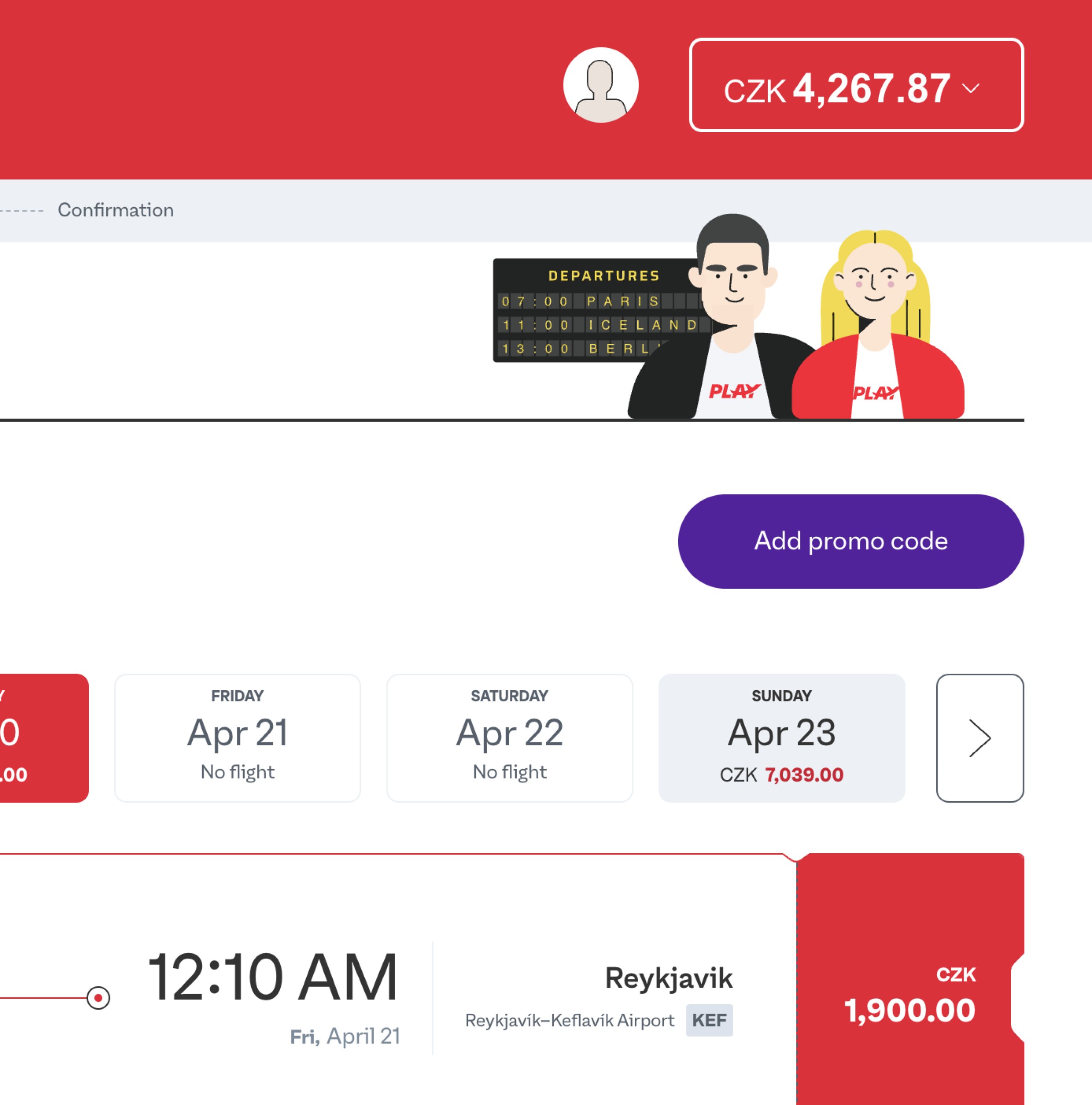 Vous disposez d'un code promo valide et actuel de Play Airlines et vous ne savez pas où l'introduire ? Tout d'abord, recherchez des vols, sélectionnez des dates spécifiques dans le calendrier et continuez jusqu'à l'horaire de vol détaillé.