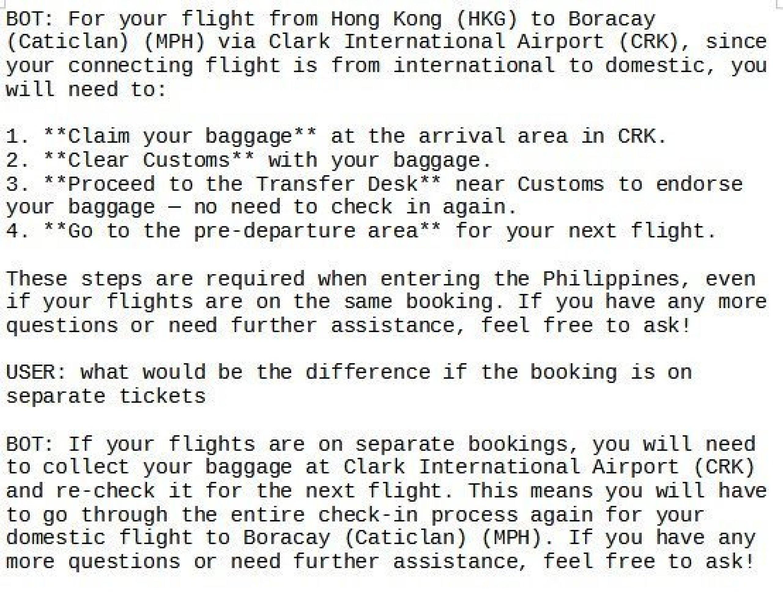 Bonjour, j'ai posé une question similaire sur le chat, je prends l'avion en février. Je vais prendre l'avion en février. Mes vols sont réservés en une seule fois et pour éviter Manille, je vais passer par Clark avec une escale de 3 heures. Je m'enregistrerai en ligne. J'ai sauvegardé la transcription du chat avec le BOT, ci-joint.
