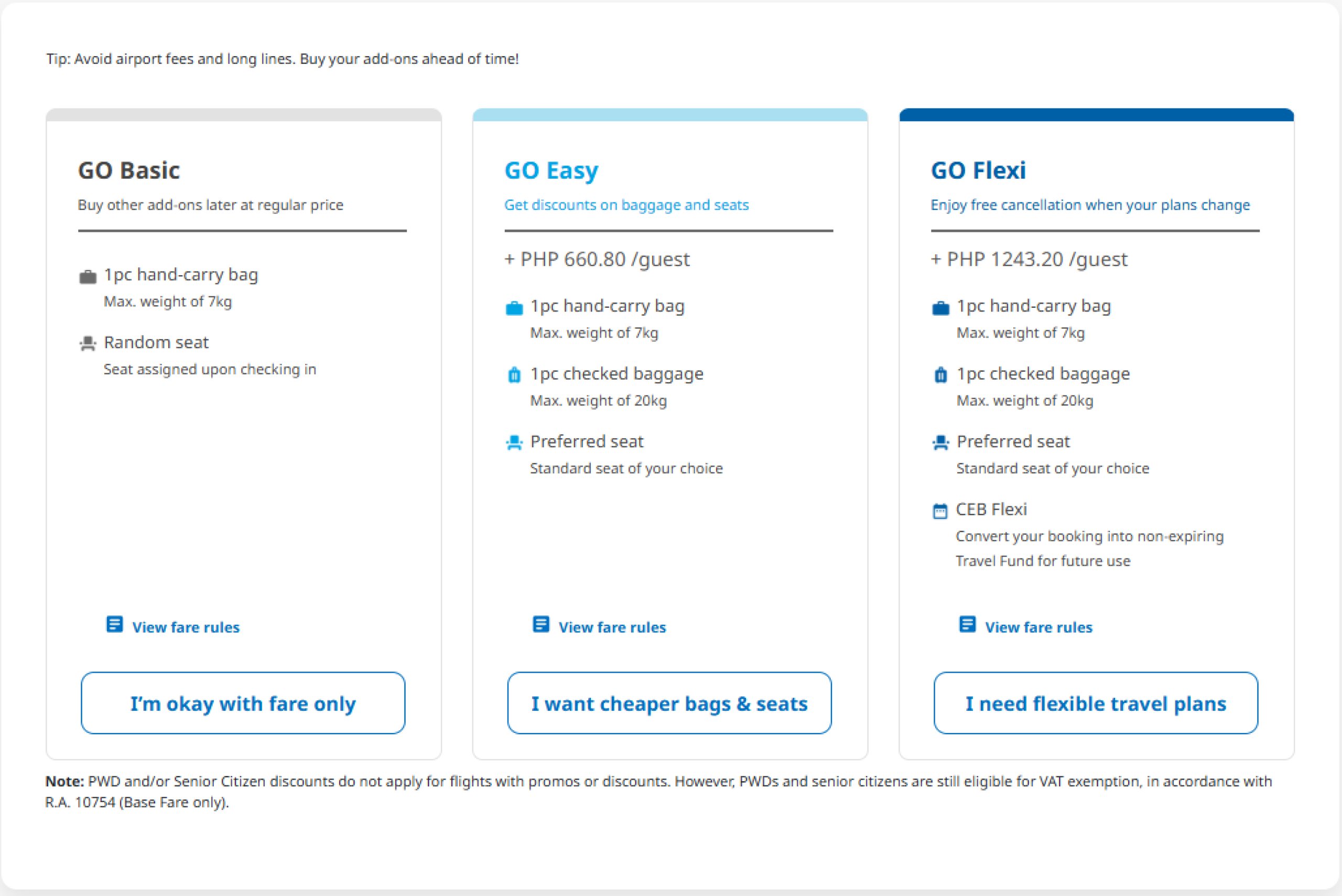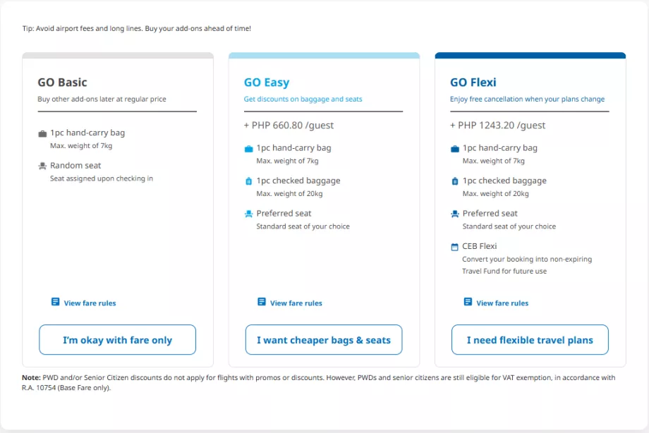 - GO Flexi - Bagage enregistré (20 kg) et bagage à main gratuits, choix du siège gratuit, annulation gratuite (l'argent sera remboursé sous forme de crédit pour une utilisation future avec Cebu Pacific).