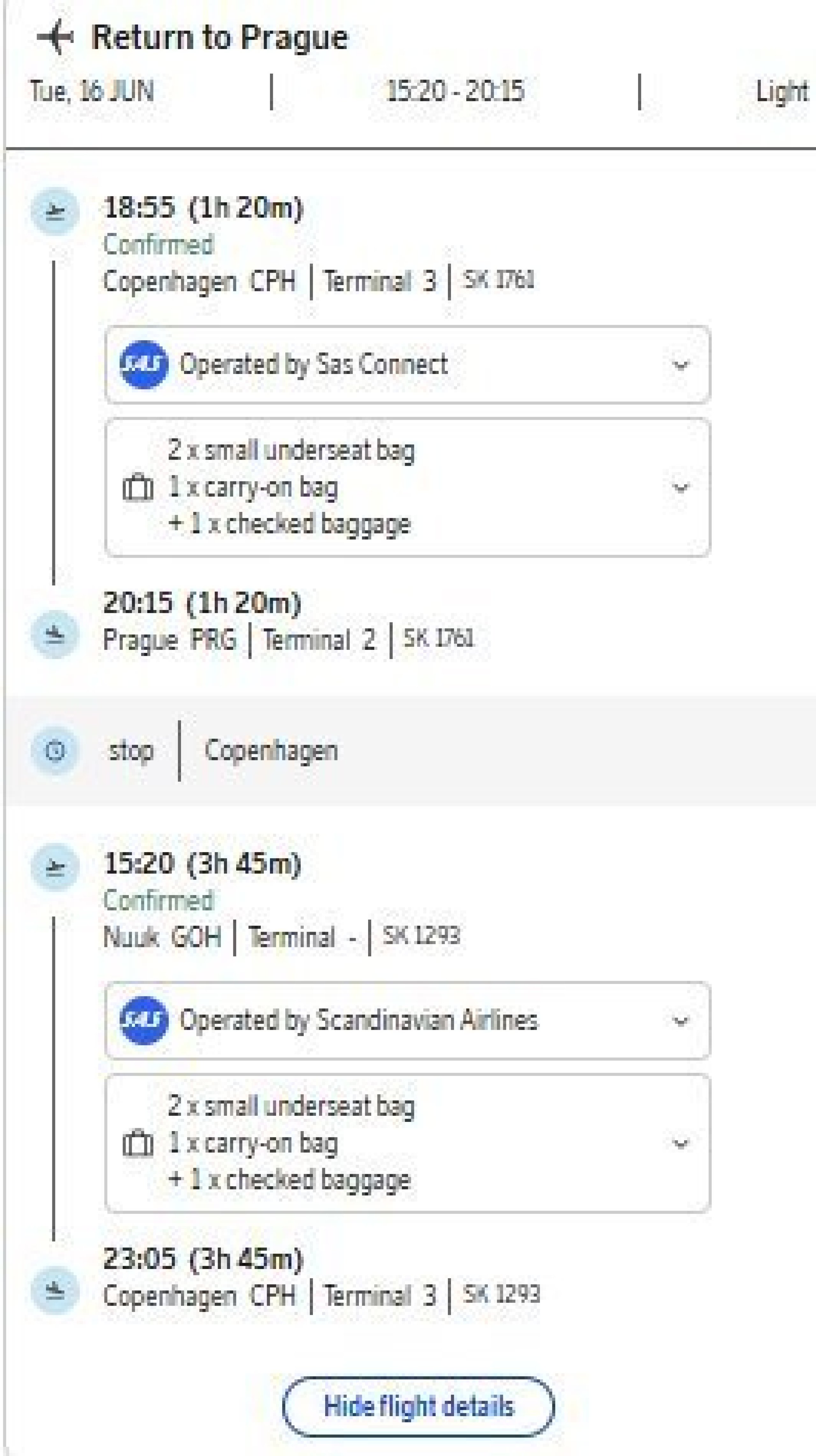 Lorsque je cherche des alternatives dans le calendrier, les vols du mardi Nuuk - Copenhague (par exemple le 16.6.) sont disponibles, mais lorsque j'entre Nuuk -Prague pour le 16.6., il est souligné en rouge que les vols ne sont pas disponibles. Les vols de Copenhague à Prague le 17.6. sont disponibles.