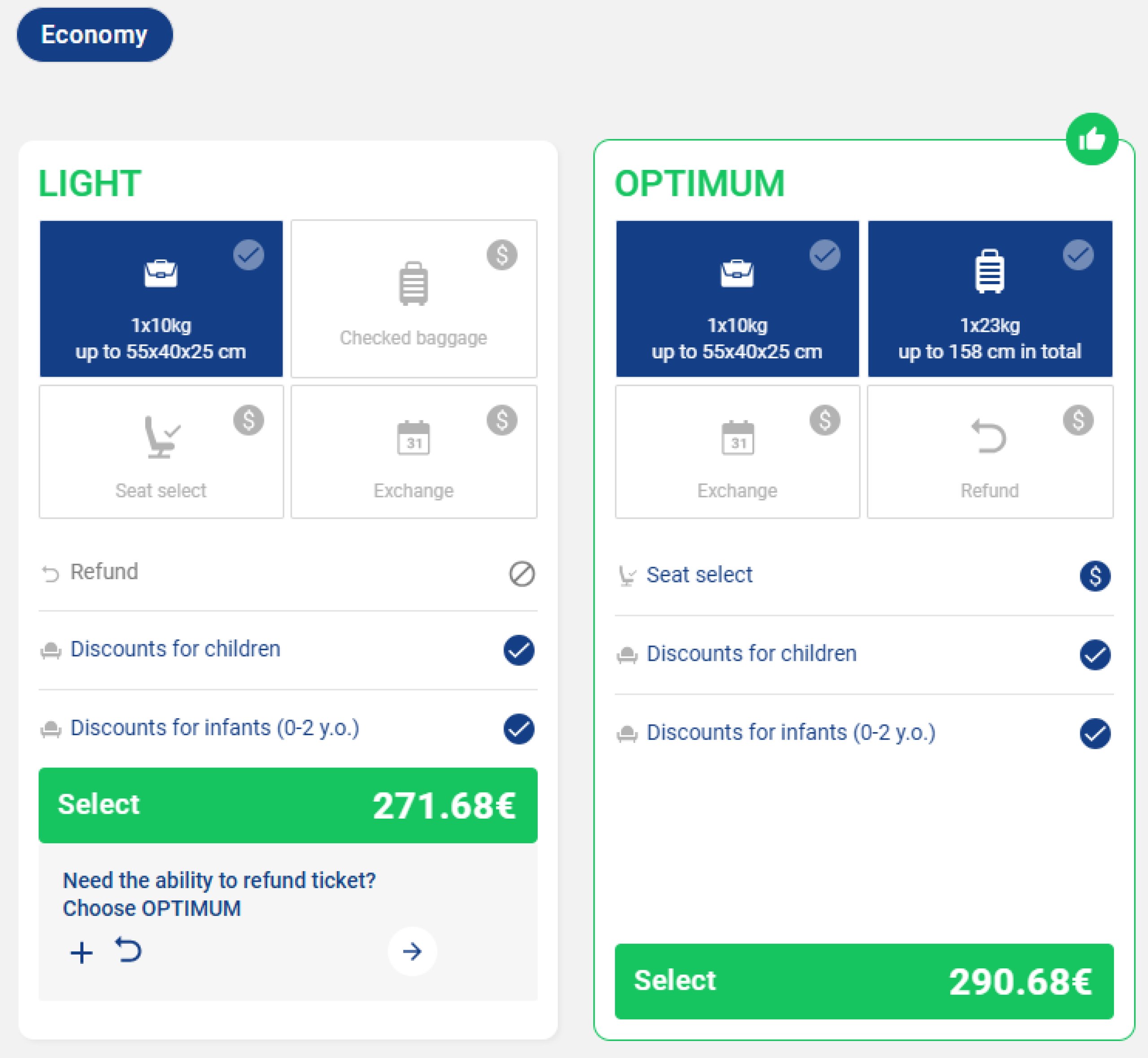- Optimum - Bagages à main et bagages enregistrés jusqu'à 23 kg, choix du siège payant, modifications et annulations autorisées moyennant des frais.