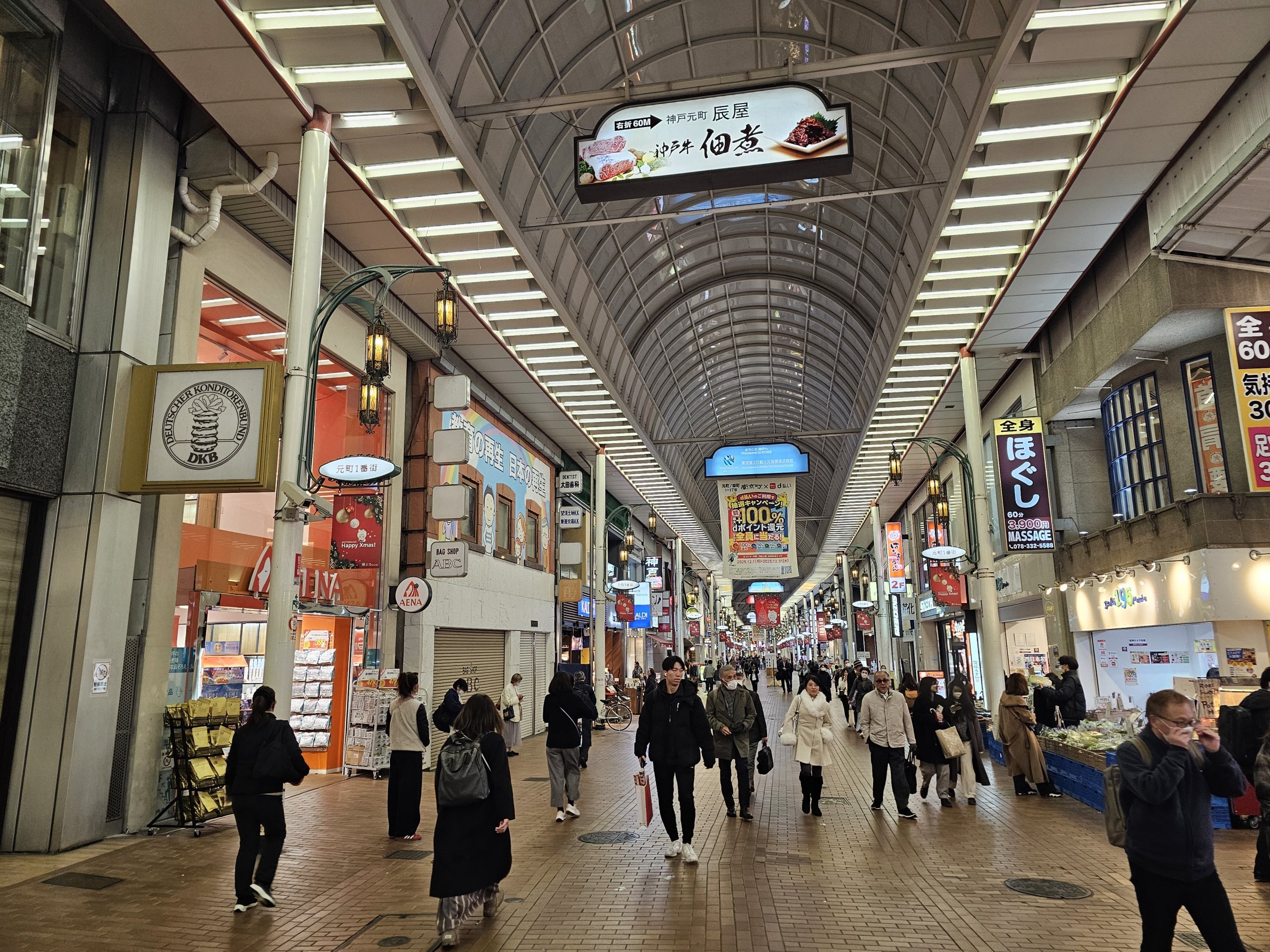 La rue Motomachi se connecte naturellement à un ensemble d'autres rues commerçantes comme Ikuta Road ou Sannomiya Center Gai Shopping Street en direction de la gare de Sannomiya.