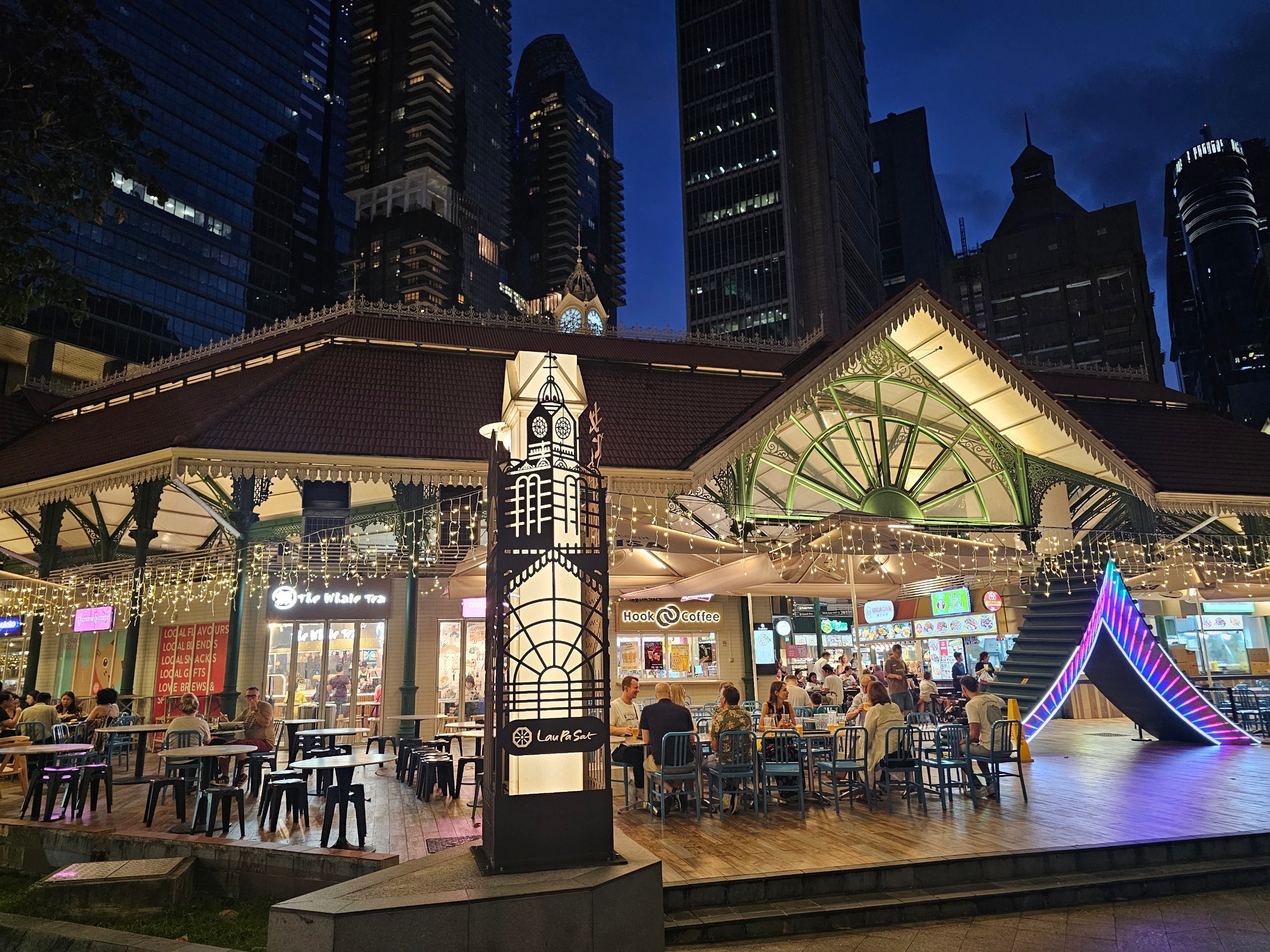 L'atmosphère est complètement différente de celle qui règne à l'intérieur du marché : l'odeur de la viande grillée, la fumée des grilles et l'animation nocturne créent l'une des expériences de street food les plus emblématiques de Singapour.