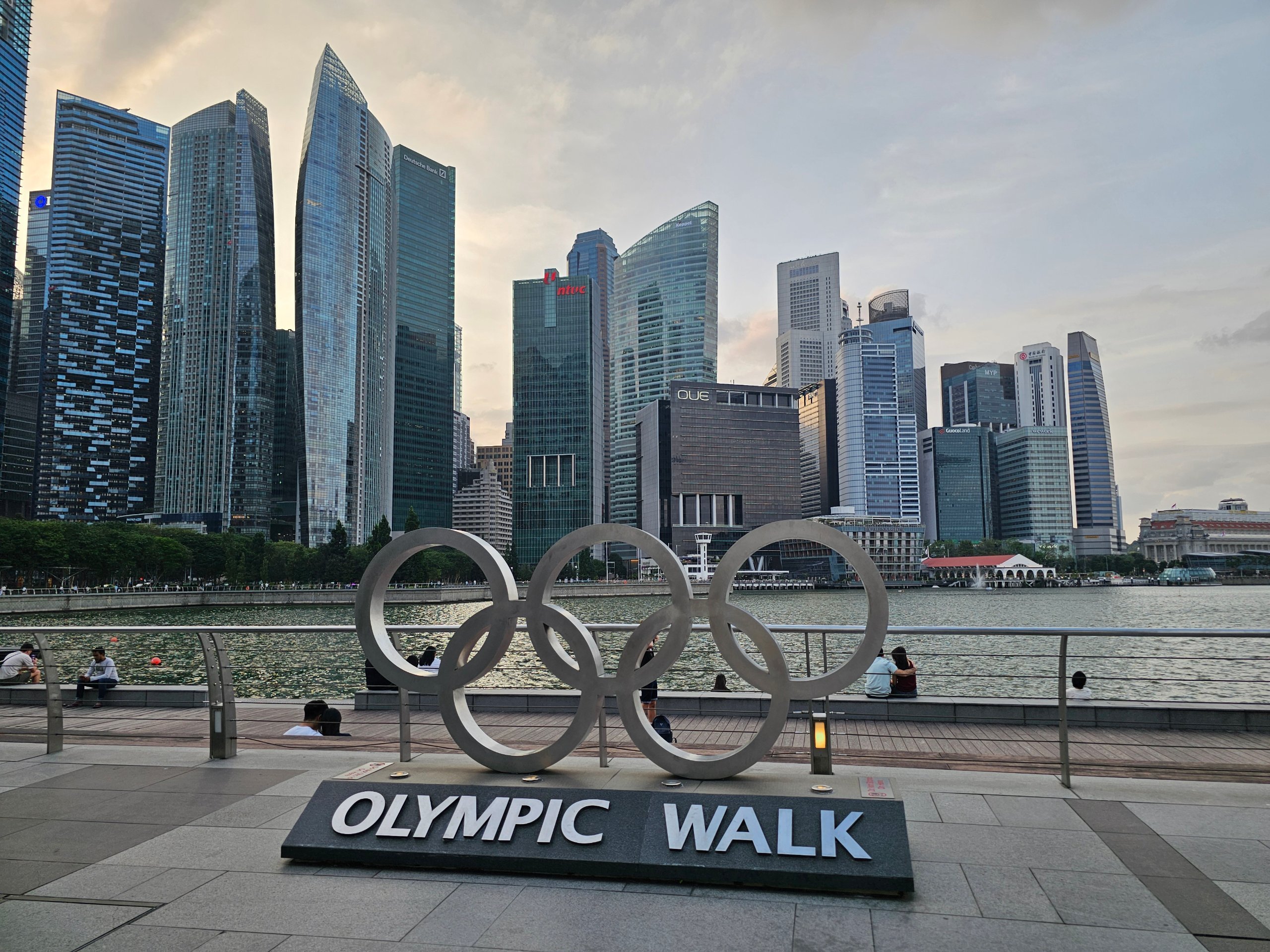 La large promenade piétonne bordée de palmiers, dont une partie s'appelle Olympic Walk, est l'un de mes endroits préférés à Singapour.