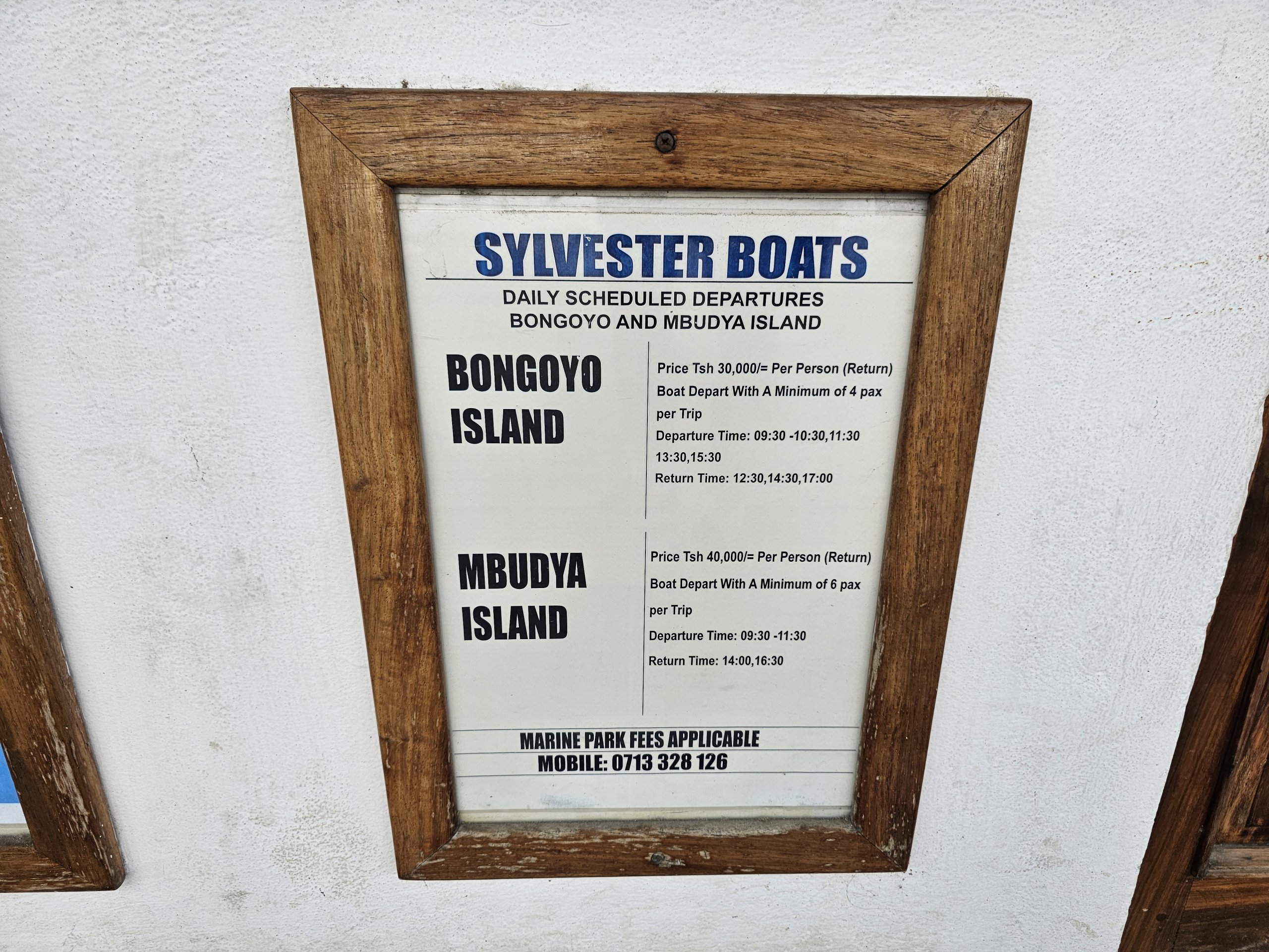 - Prix - billet de bateau aller-retour 30 000 tzs + droit d'entrée à la réserve naturelle de Bongoyo 50 000 tzs