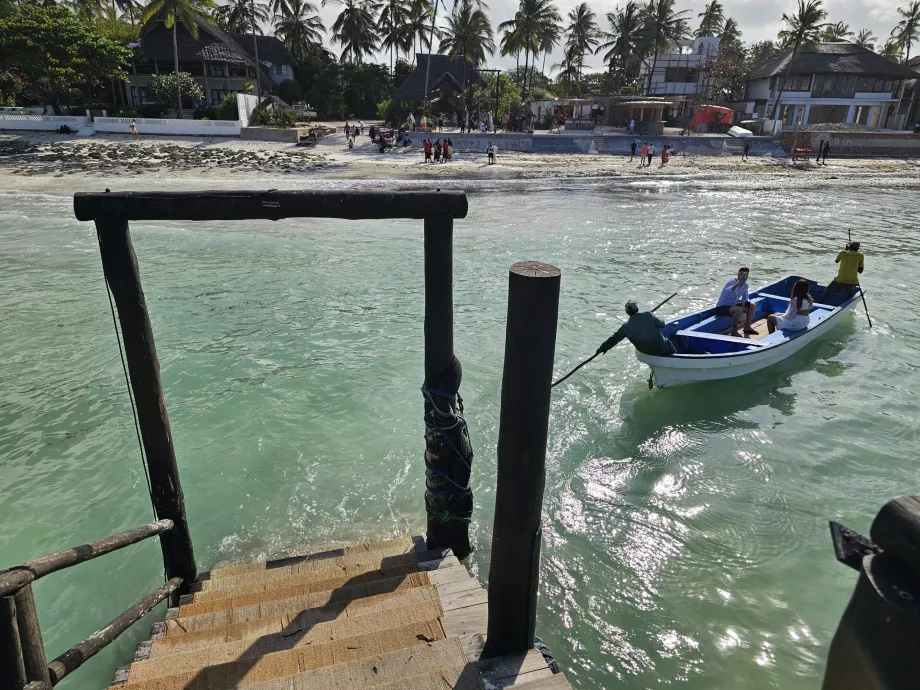 À marée haute, un petit bateau fait constamment la navette entre la plage et le restaurant. Le trajet dure une minute et est gratuit.