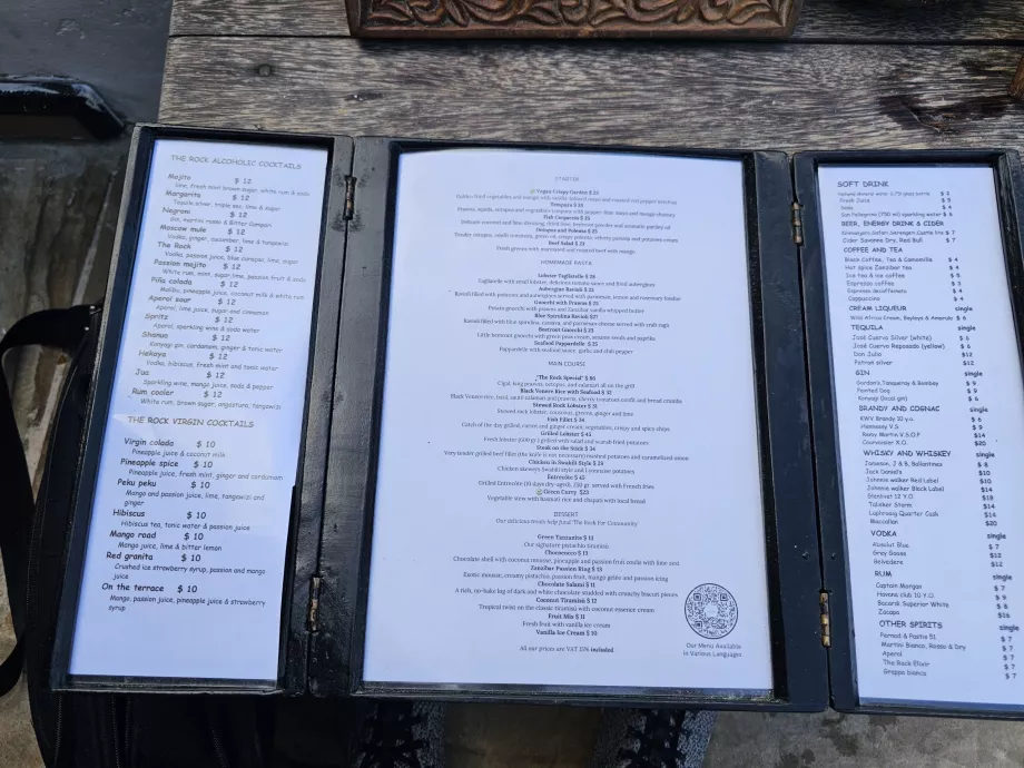 Le menu complet peut être consulté sur le site web du restaurant : therockrestaurantantzanzibar.com.