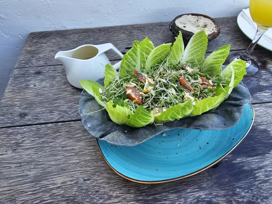 En guise d'entrée, j'ai choisi une salade locale avec des graines de sésame et du pain. C'était excellent !