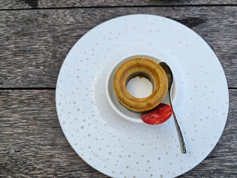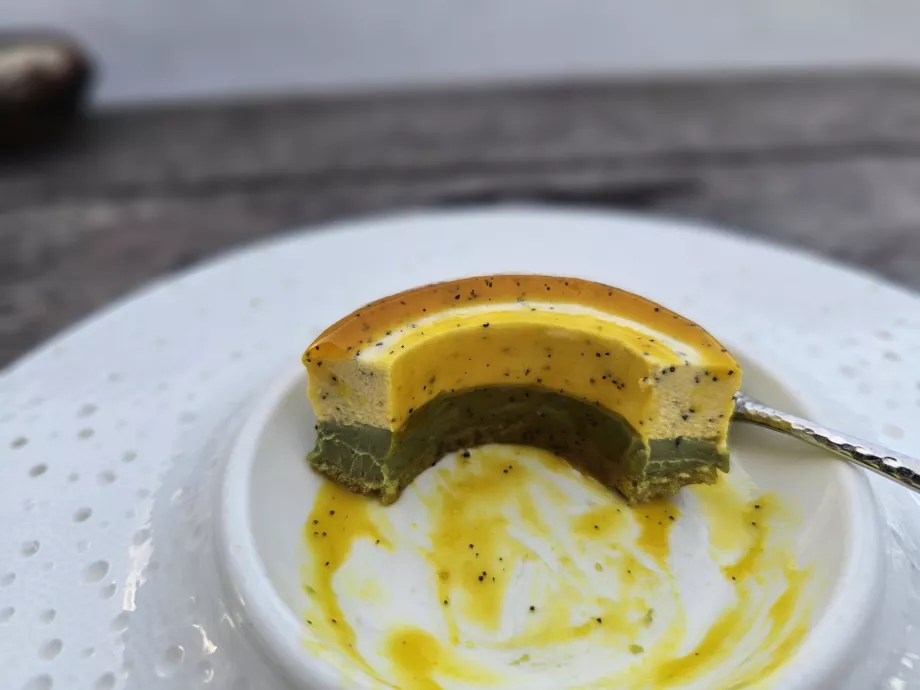 Mais le meilleur était sans aucun doute le dessert. Probablement l'un des meilleurs que j'aie jamais mangés. Vous le trouverez sur le menu sous le nom de Zanzibar Passion Ring et vous obtiendrez un gâteau à la crème de maracuja et de pistache. Génial.