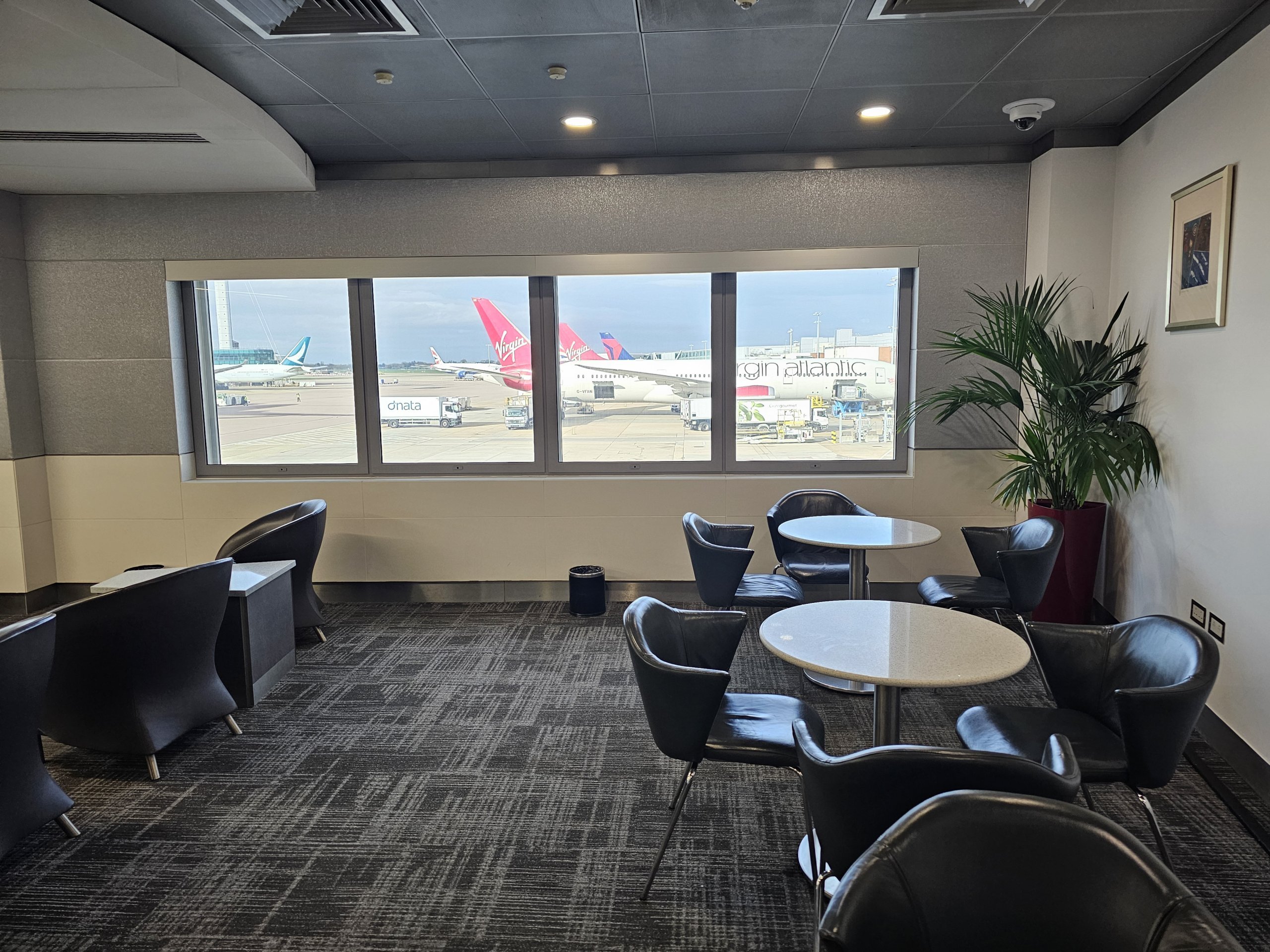 Le salon offre une vue imprenable sur le tarmac de l'aéroport: des avions long-courriers sont stationnés juste devant le salon, et vous pouvez également apercevoir la tour emblématique de l'aéroport Heahtrow d'ici.