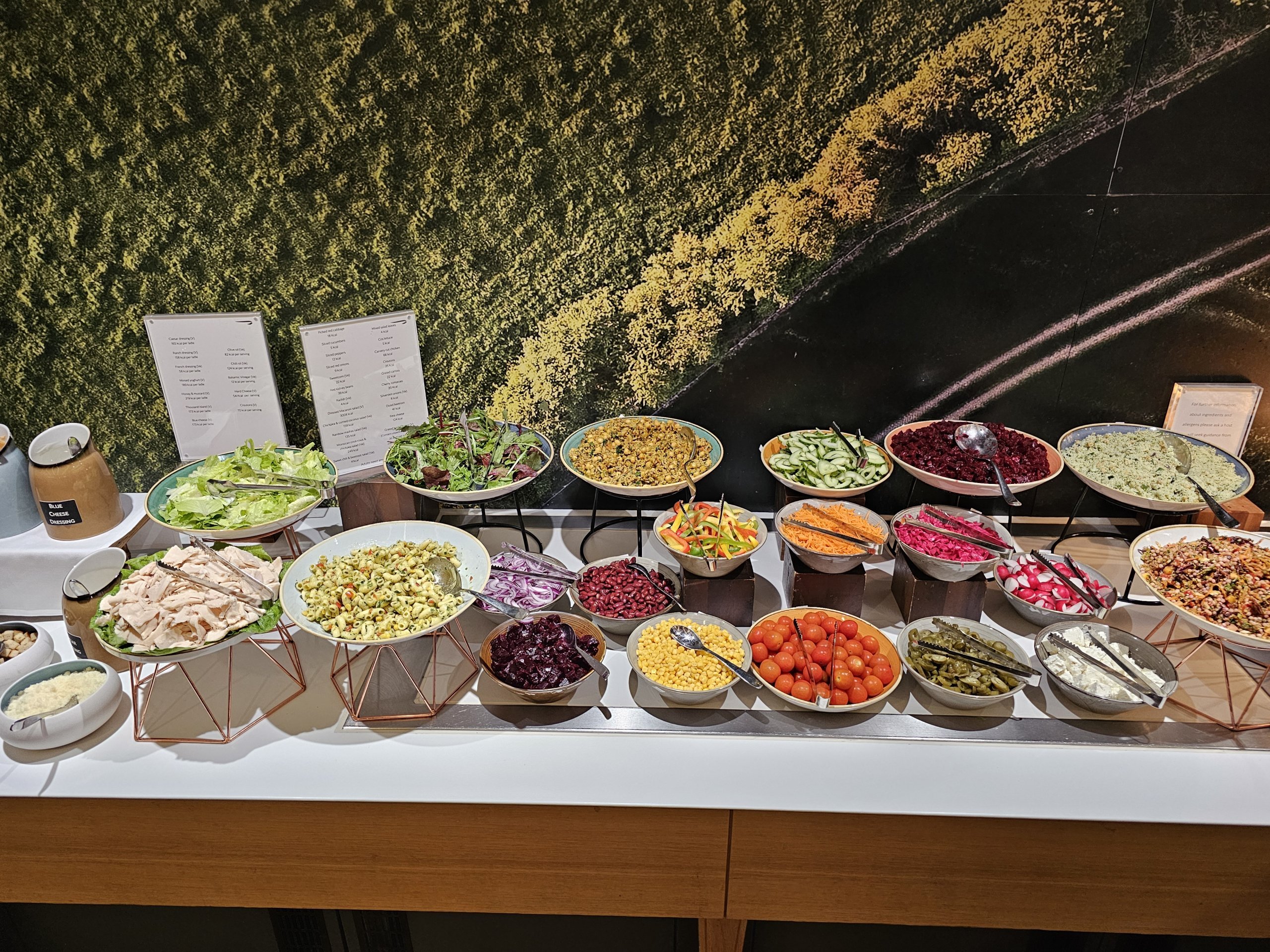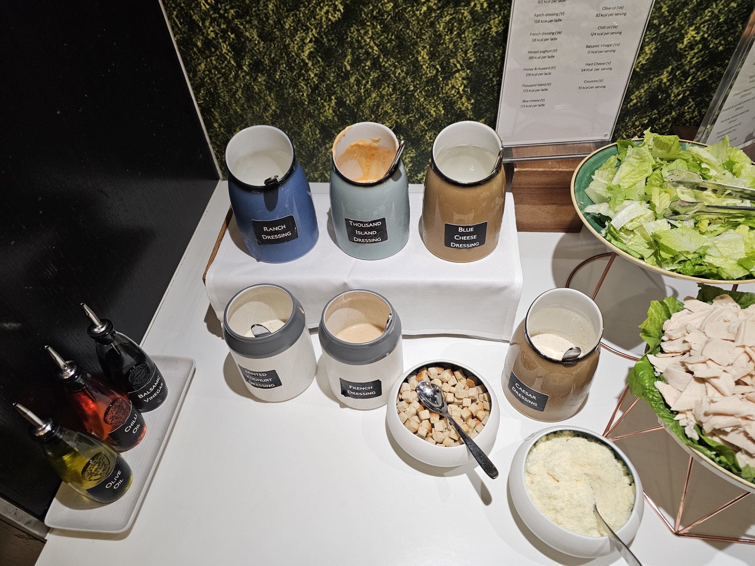 Le menu froid comprend quelques légumes, une salade avec un choix de différentes vinaigrettes et un choix très limité et faible de pâtisseries (pratiquement uniquement sucrées).