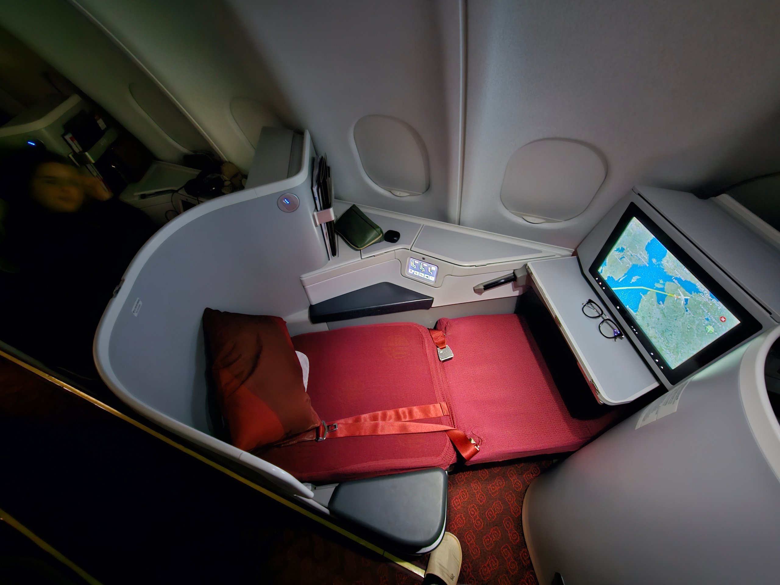 Il n'y a pas beaucoup d'espace pour les jambes en position allongée, mais la largeur du siège et la séparation des couloirs sont adéquates. À cet égard, l'intimité est parfaite. Je ne vois pratiquement aucun passager lorsque je suis allongé.