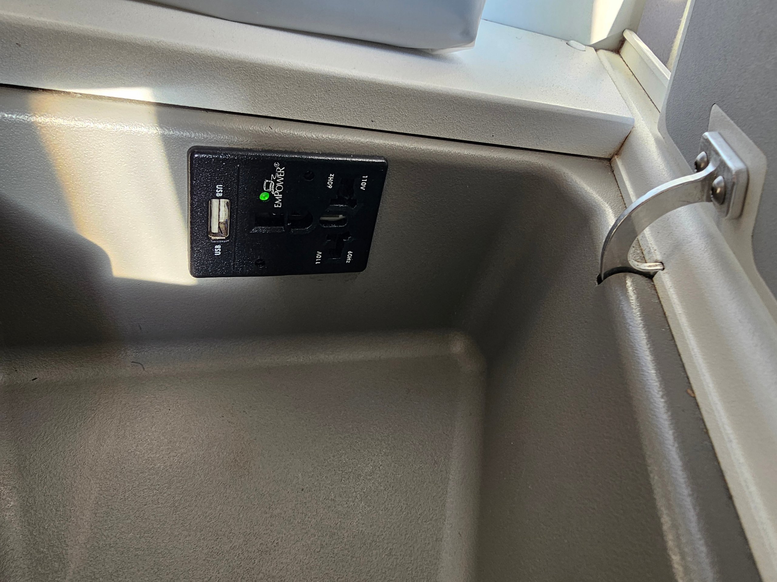 Les commandes du siège sont simples, via l'écran tactile de gauche, ancien mais fonctionnel. Il y a également une petite lampe de lecture et une prise de courant universelle avec un port USB-A.