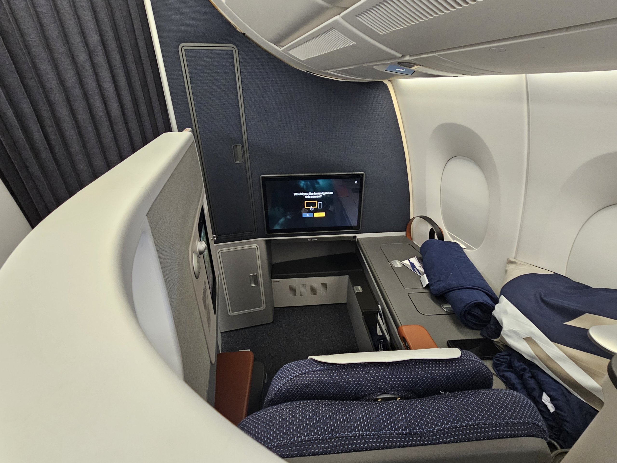 Nous volons sur un Airbus A350-900 qui n'a que quelques mois d'existence, et la cabine de la classe affaires semble neuve et moderne au premier coup d'œil.