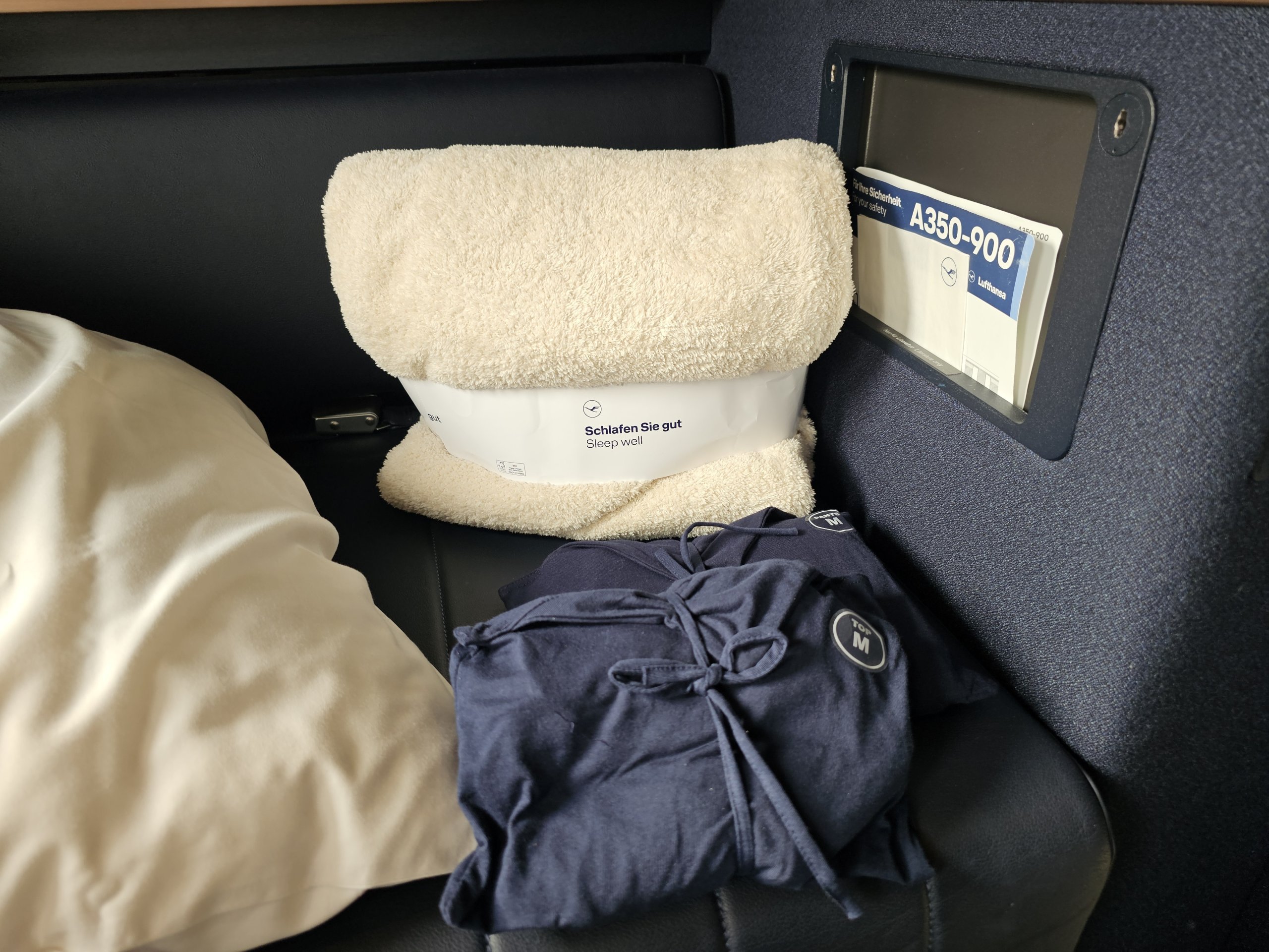 Peu après le déjeuner, je me rends aux toilettes pour me mettre en pyjama. Pendant ce temps, un steward serviable prépare mon lit (vous pouvez déplier le siège vous-même en appuyant sur un bouton, mais les draps et la couverture sont placés dans des compartiments auxquels seul l'équipage a accès).