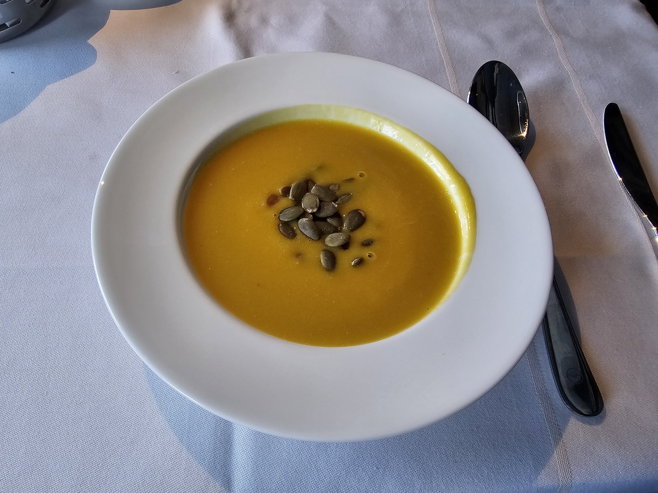 Je déguste une excellente soupe au potiron et au gingembre avant le repas.