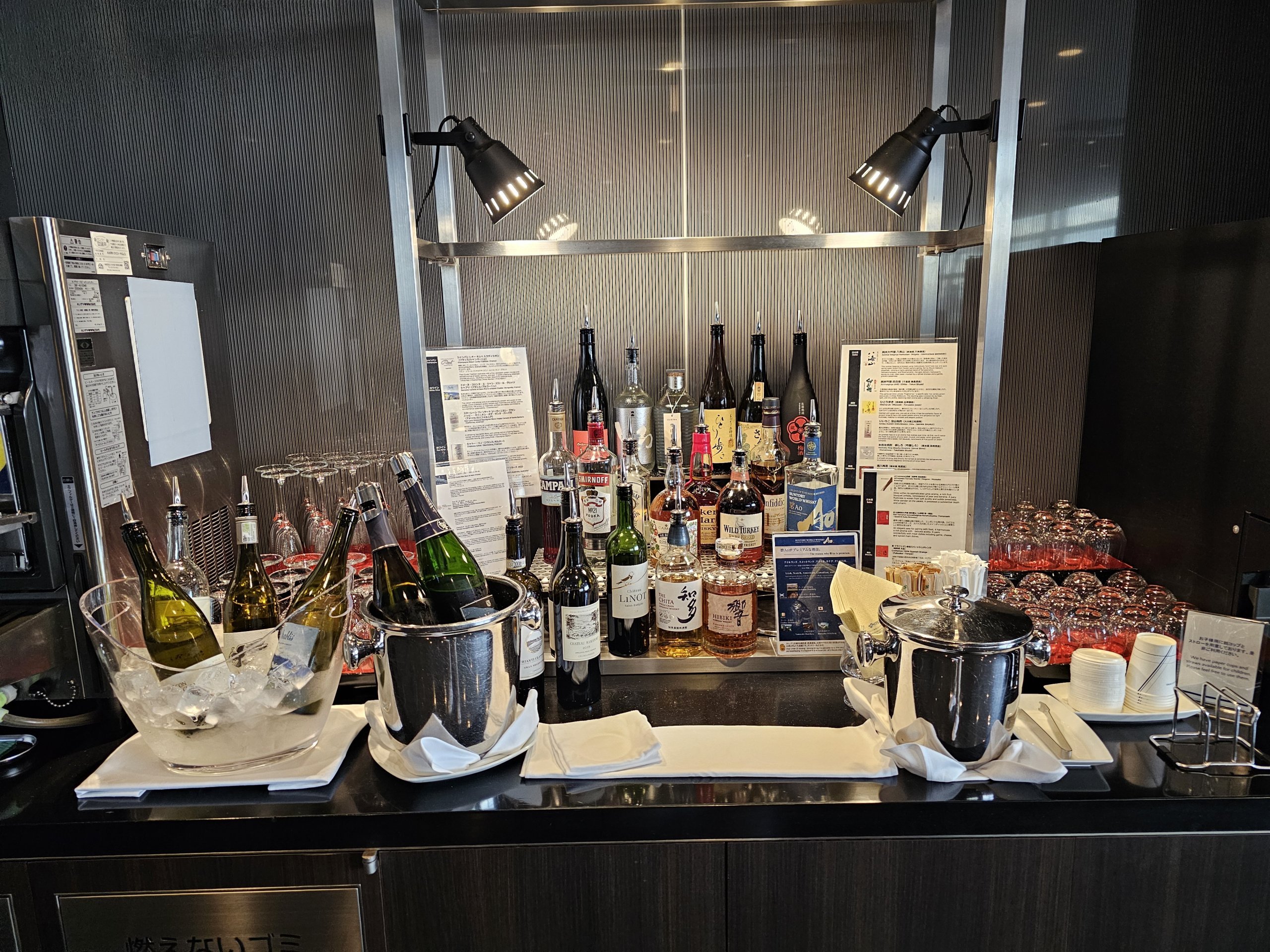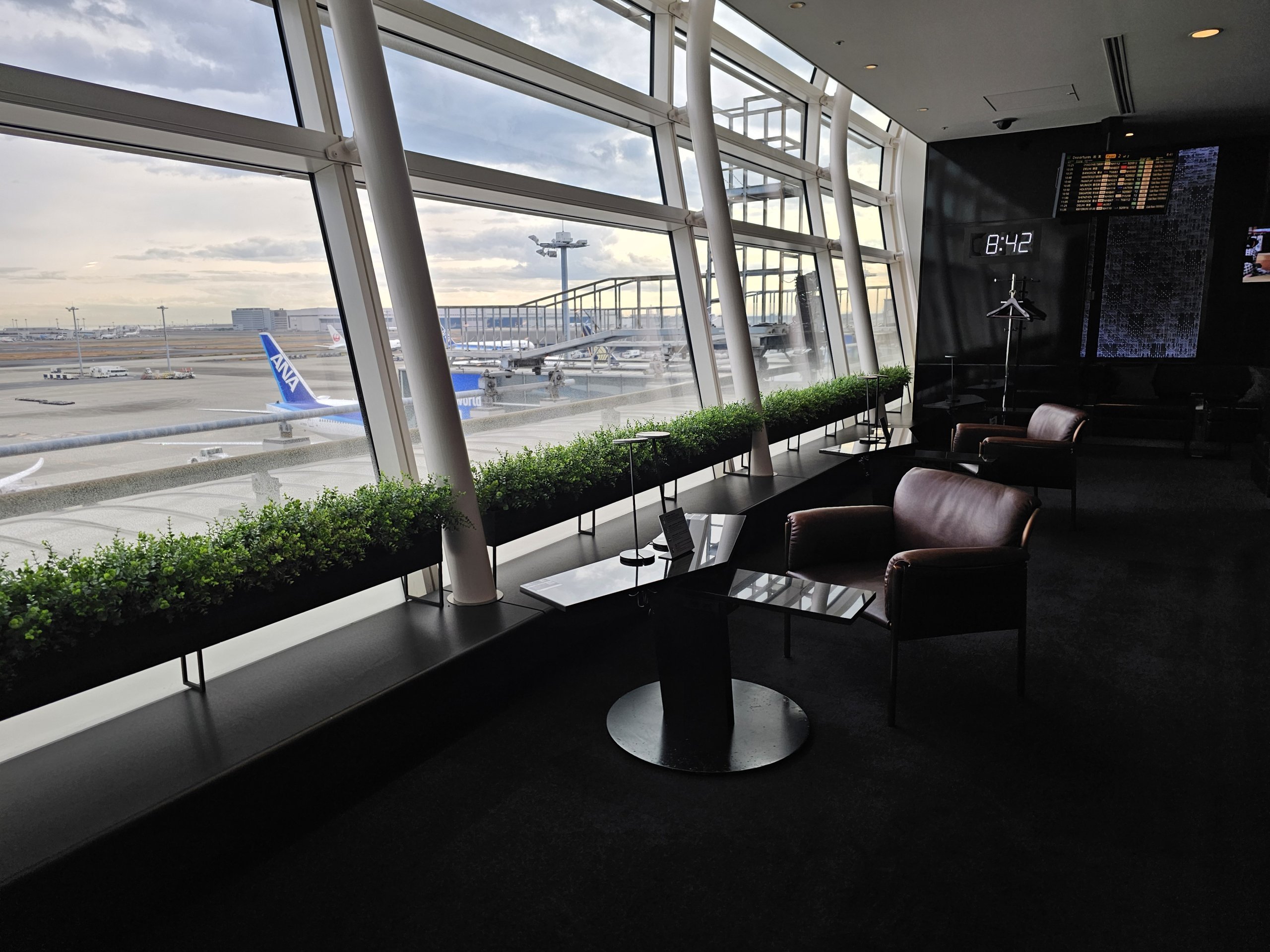 Le salon est très spacieux, avec une vue imprenable sur le tarmac et de nombreuses cabines qui imitent les sièges de première classe d'ANA Japan Airlines.