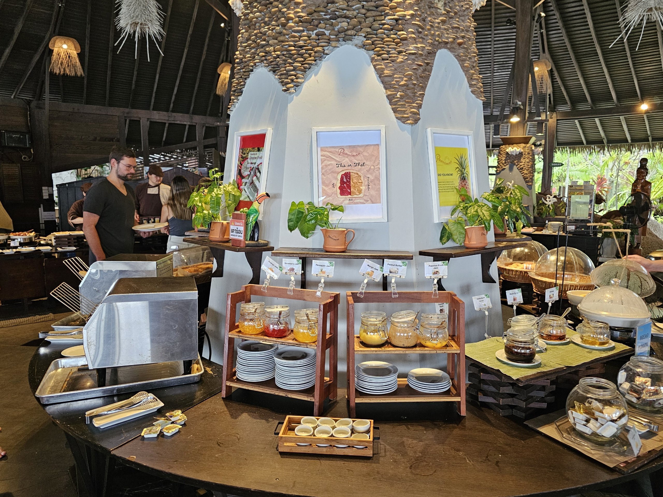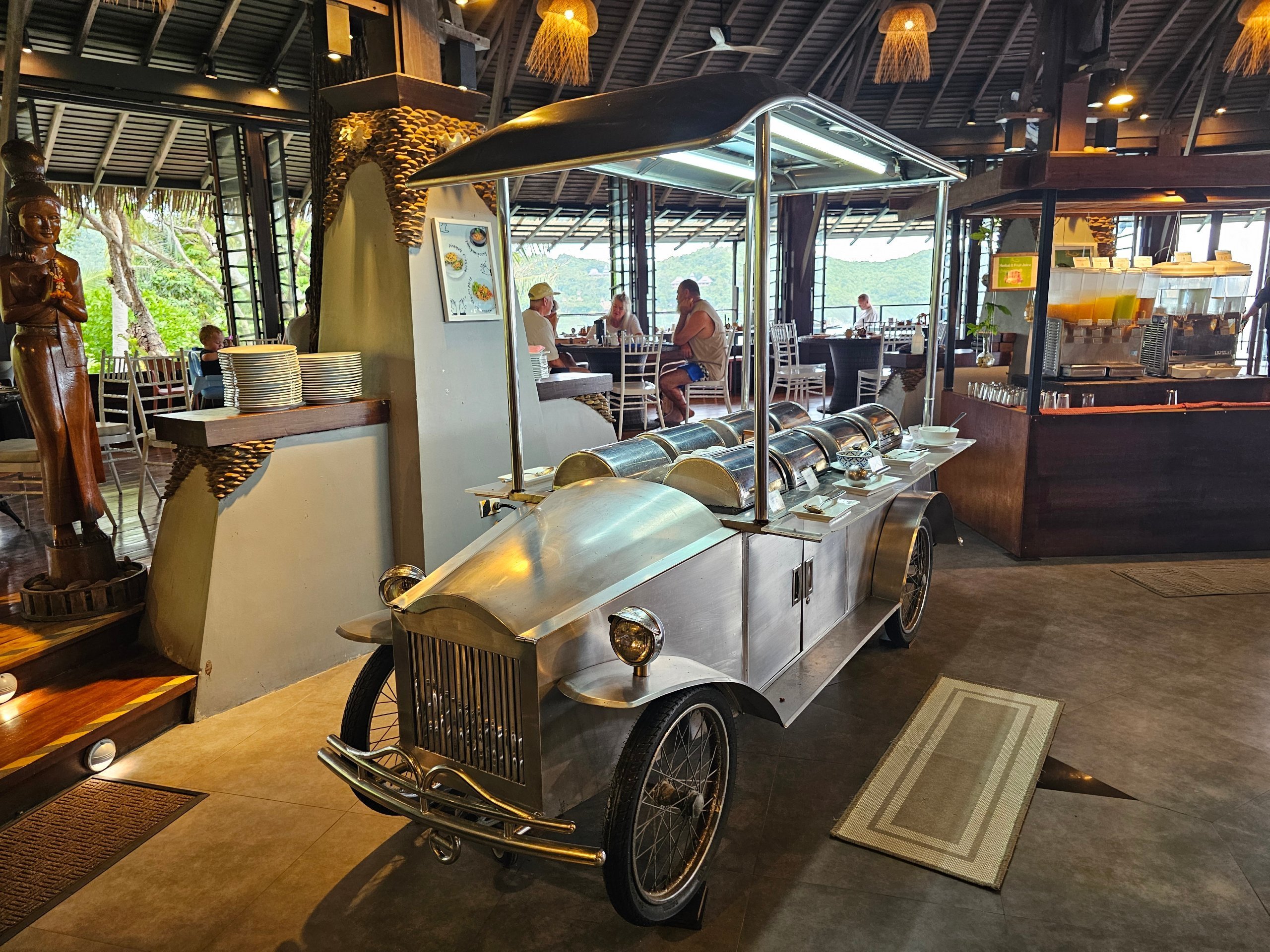 Le petit-déjeuner au Panviman Resort Koh Phangan est servi dans le restaurant principal, sur la colline surplombant la mer.