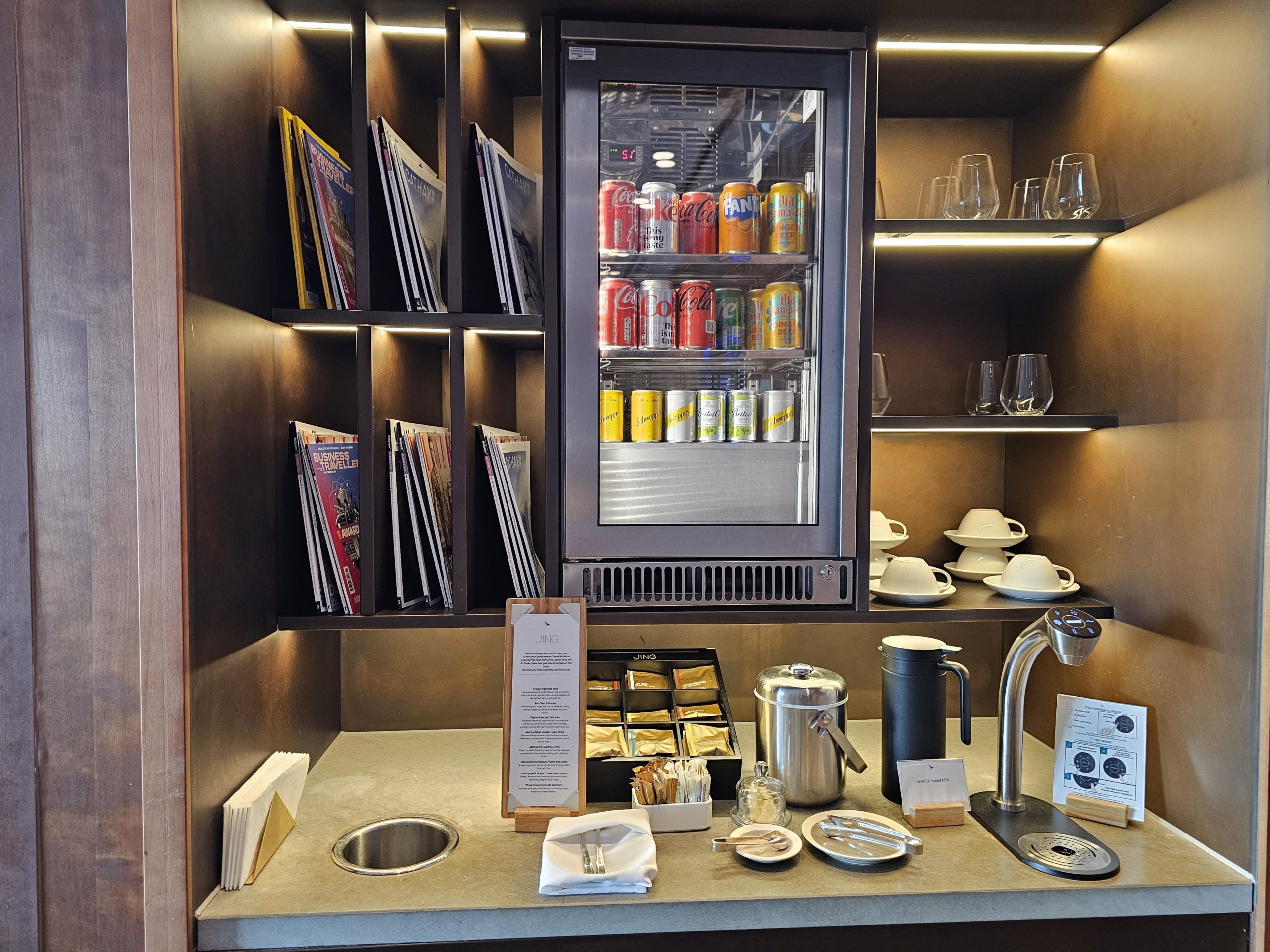 Il y a des machines à café à différents endroits du salon et une sélection assez étendue de thés Jing.