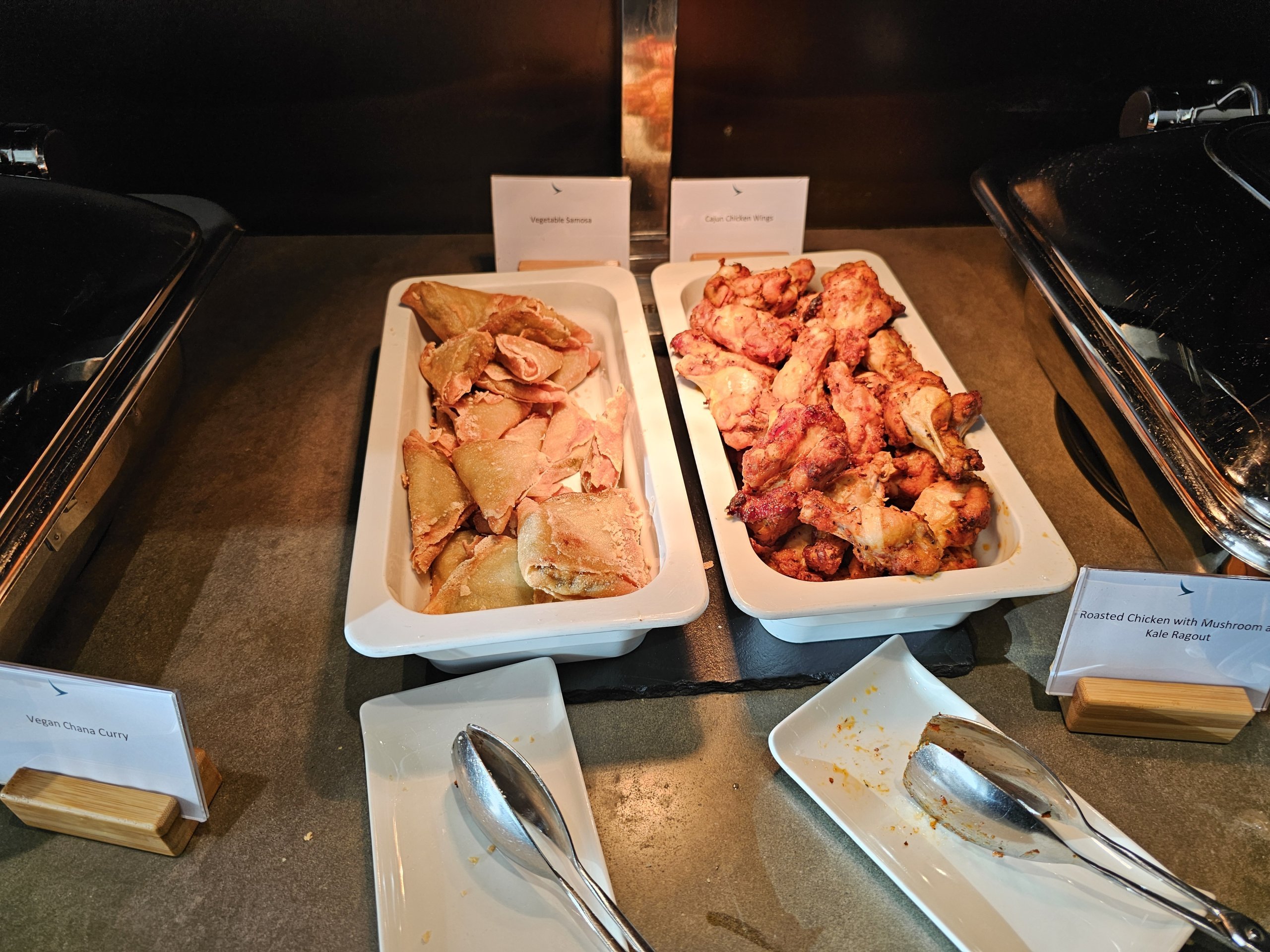 Cependant, le menu du jour était savoureux et comprenait des pilons de poulet, du poulet bouilli avec des épinards, du porc et du riz et des samosas végétariens. Le samosa en particulier m'a rappelé ma récente visite à l'île Maurice!