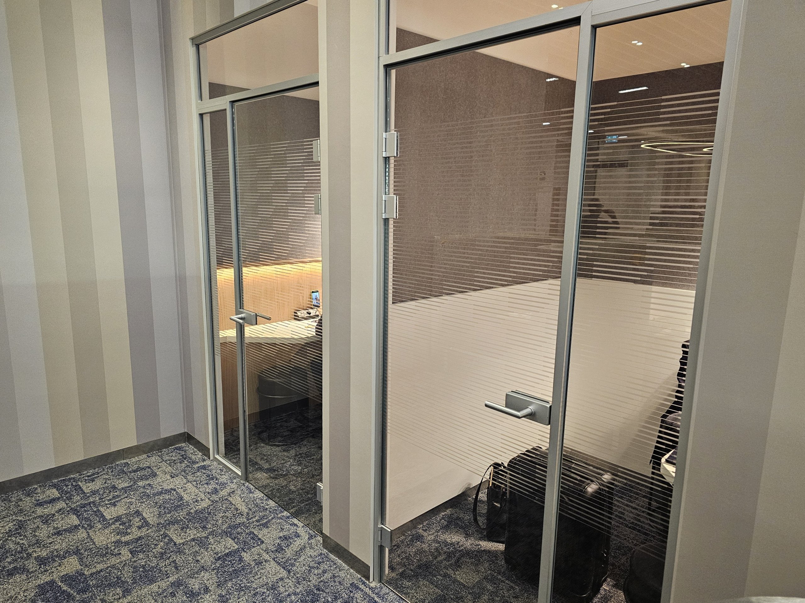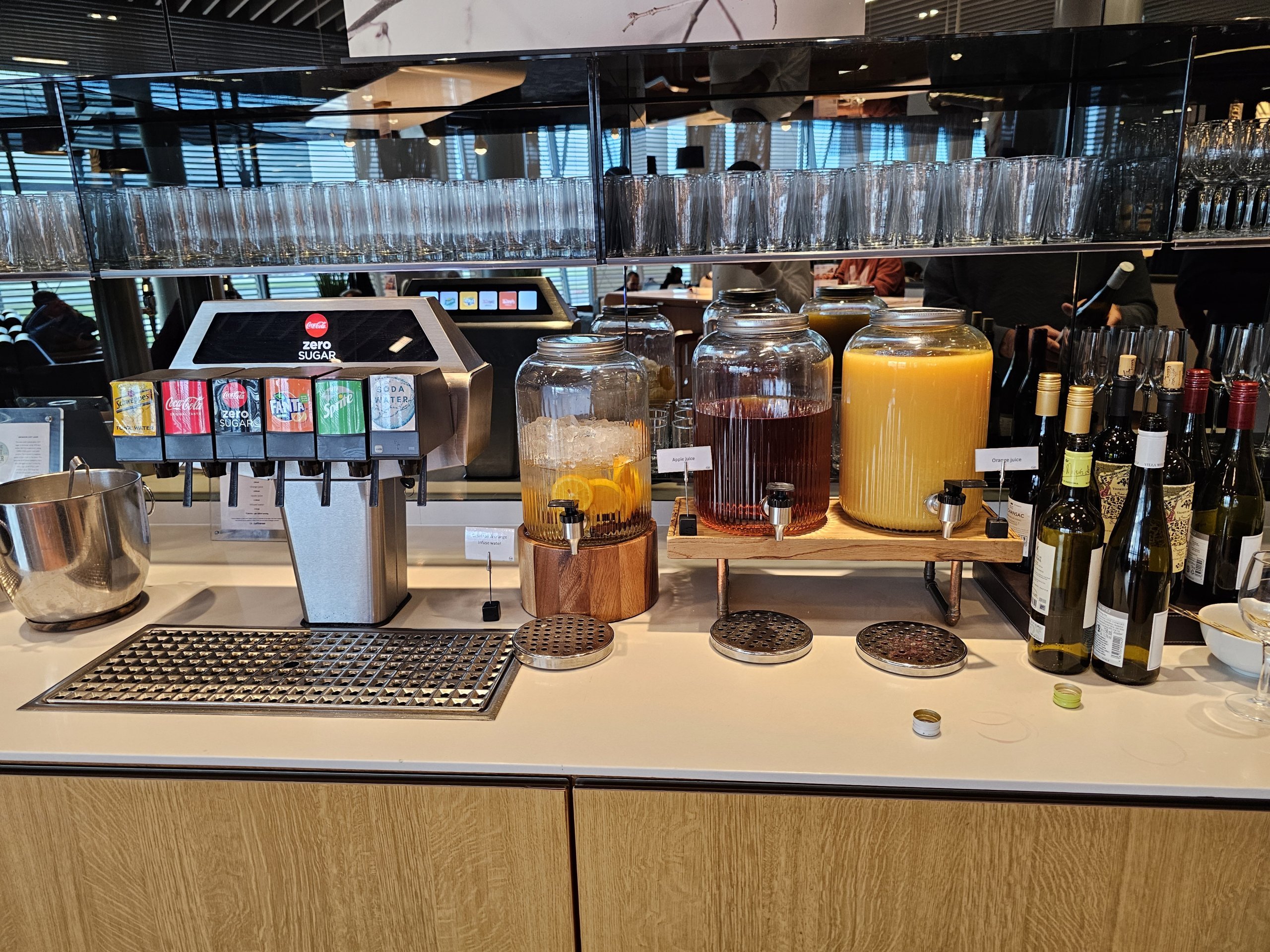 Dans l'ensemble, le salon est aéré et lumineux et offre une vue sur le tarmac de l'aéroport, bien que celle-ci soit en grande partie obstruée par de grands stores qui protègent du soleil.
